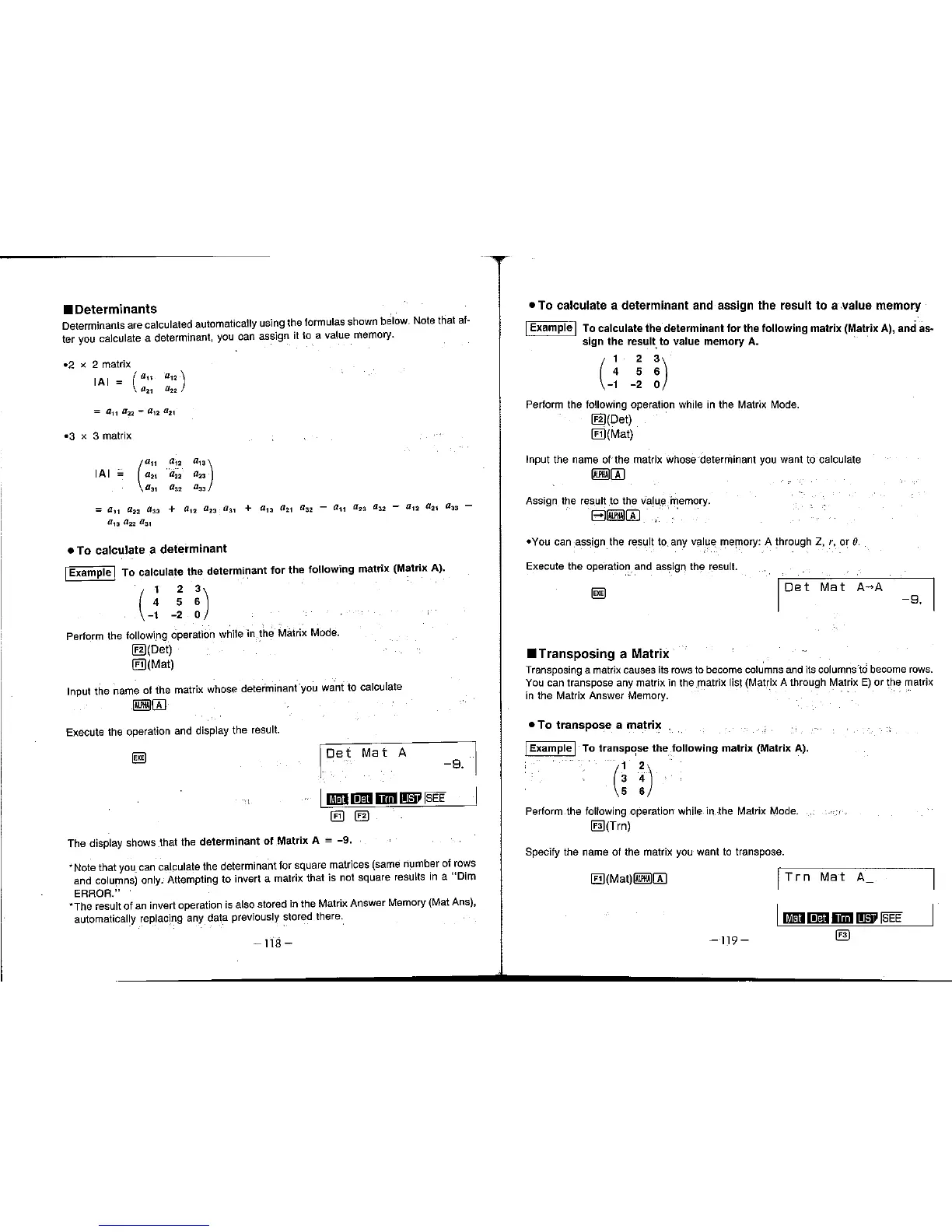 Casio FX-7700GE - To Calculate a Determinants; To Calculate a Determinant and Assign the Result to a Value Memory; To Transposing a Matrix