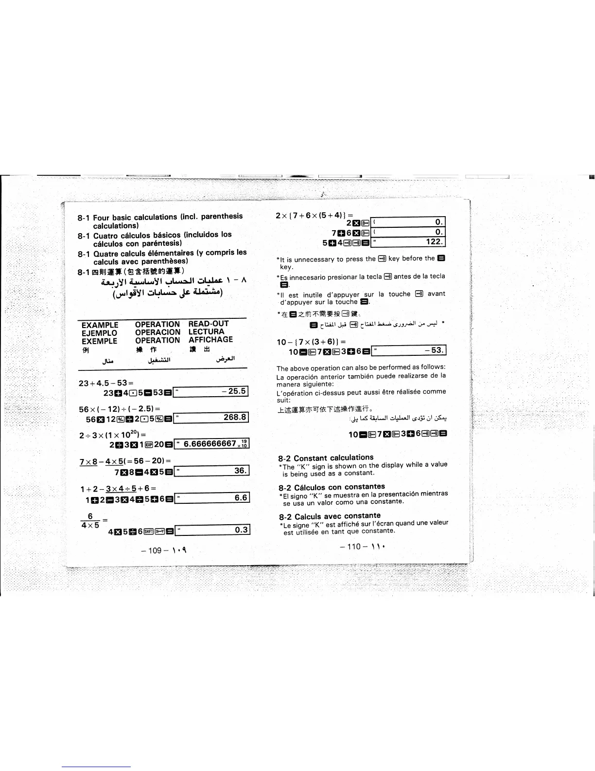 Casio FX-85SA - Four basic calculations (incl. parenthesis calculations); Constant calculations