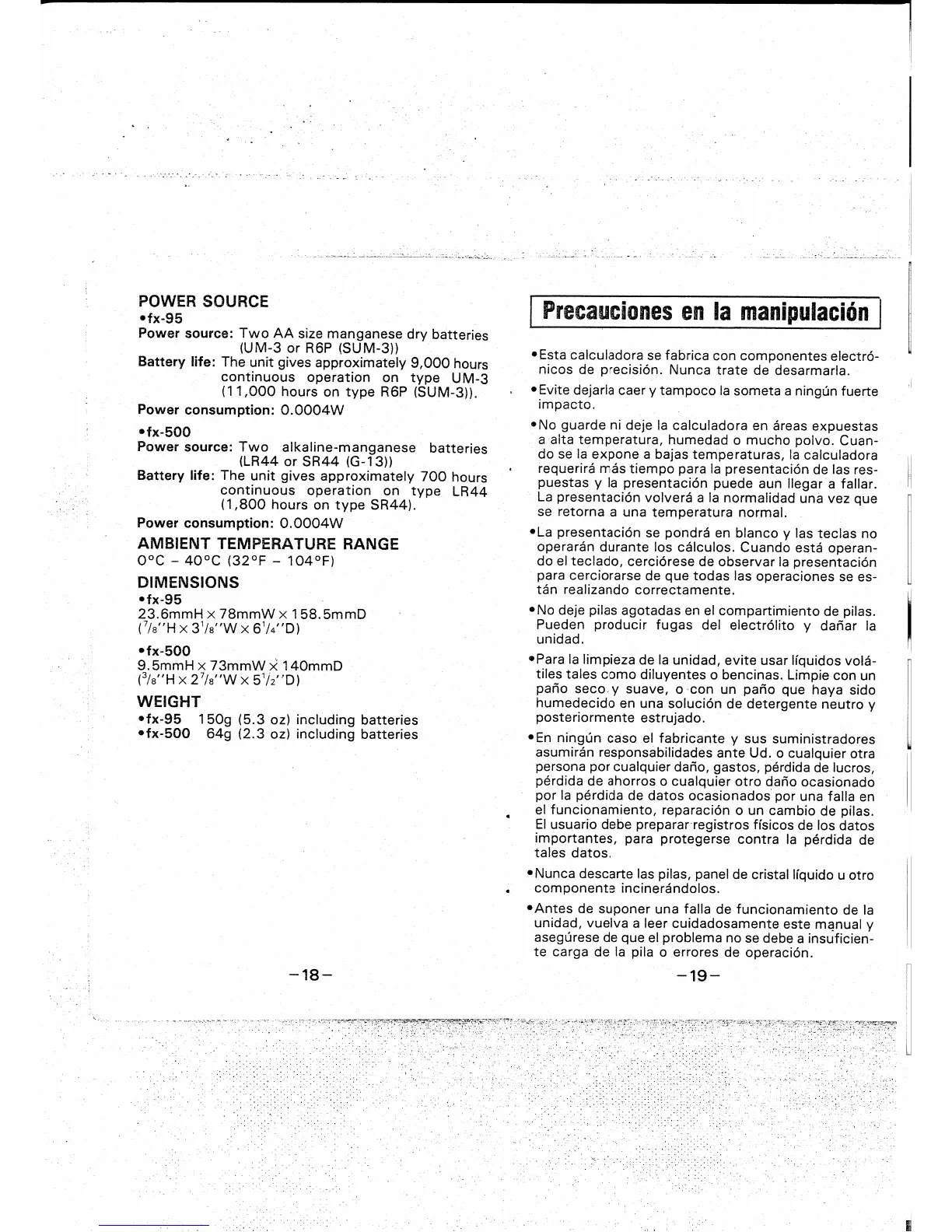 Casio FX-95 - Product Specifications Details; Power Source Information; Environmental and Physical Specs