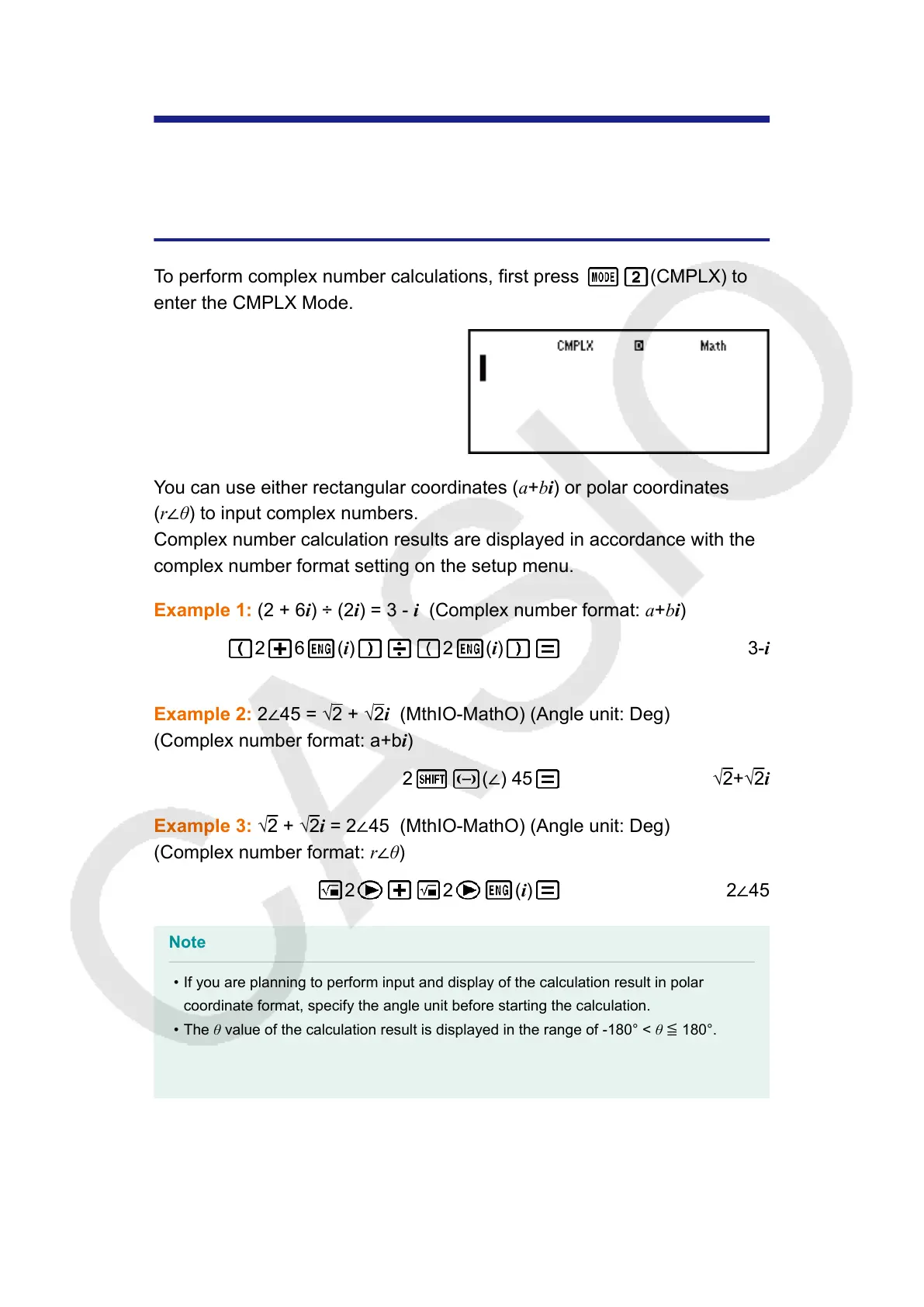 Example 2: 2∠45 = √2 + √2i (MthIO-MathO) (Angle unit: Deg)