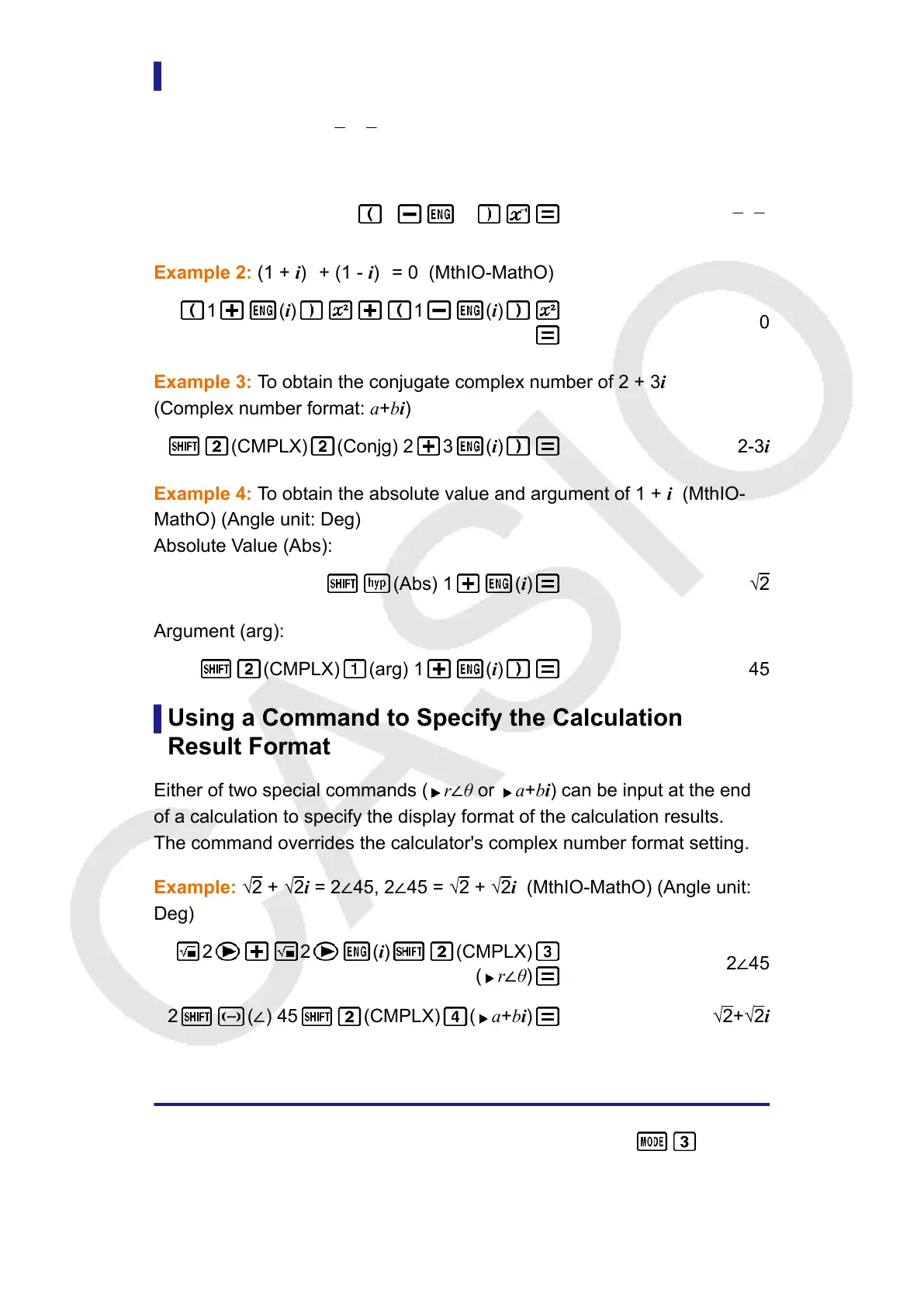 Example: √2 + √2i = 2∠45, 2∠45 = √2 + √2i (MthIO-MathO) (Angle unit: