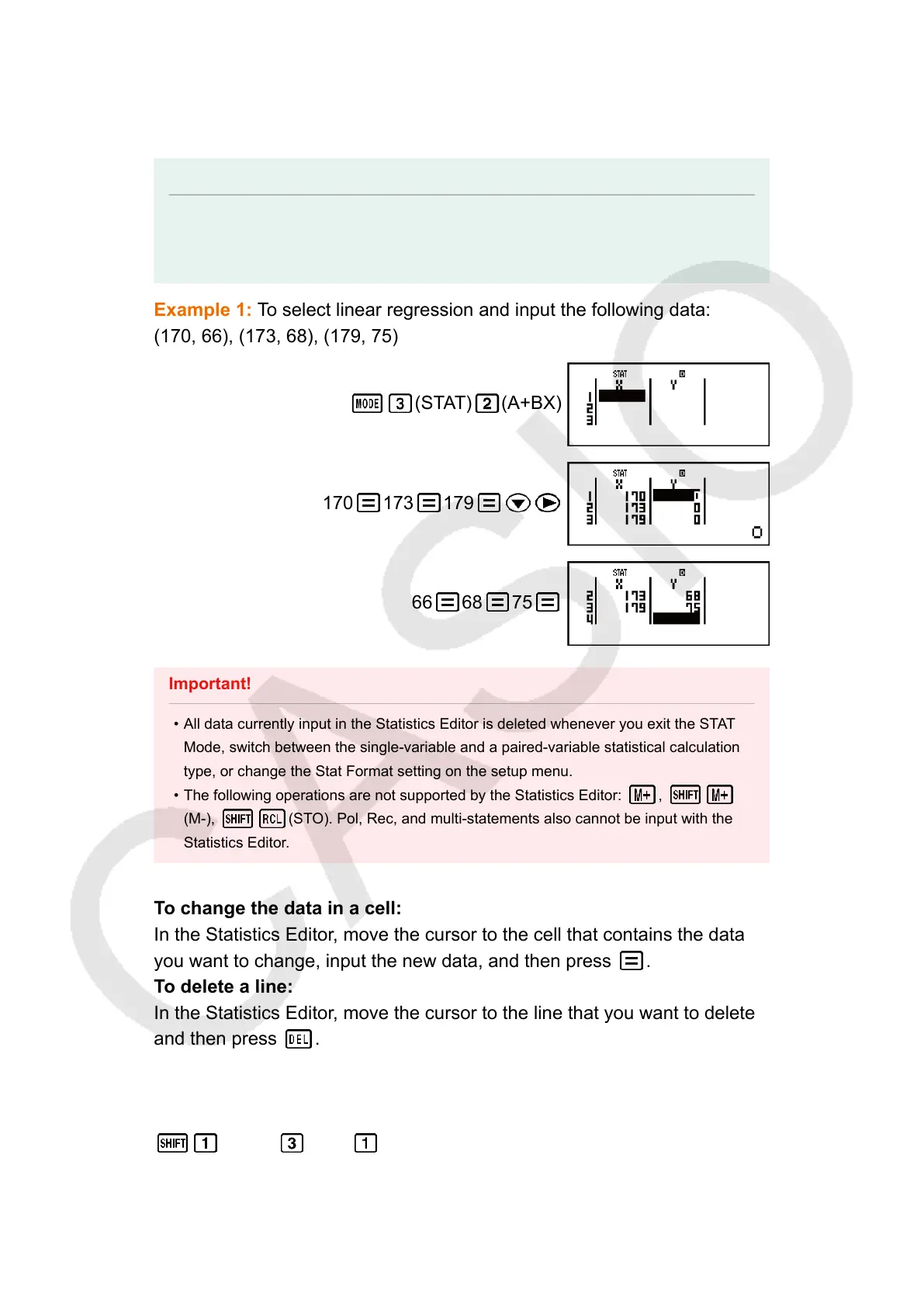 • All data currently input in the Statistics Editor is deleted whenever you exit the STAT
