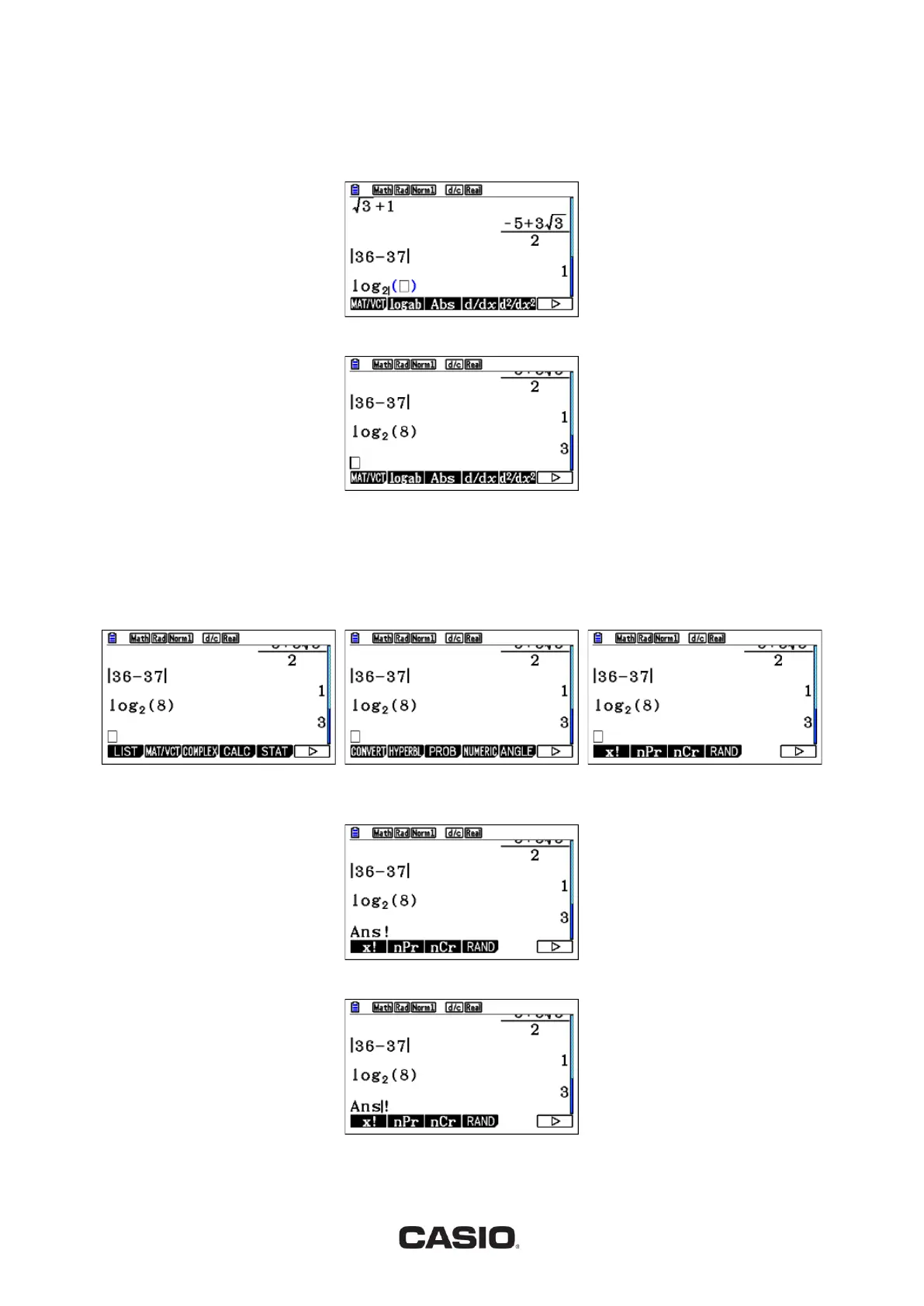 the cursor. The log to another base function is to be found in the MATH menu which is currently open.