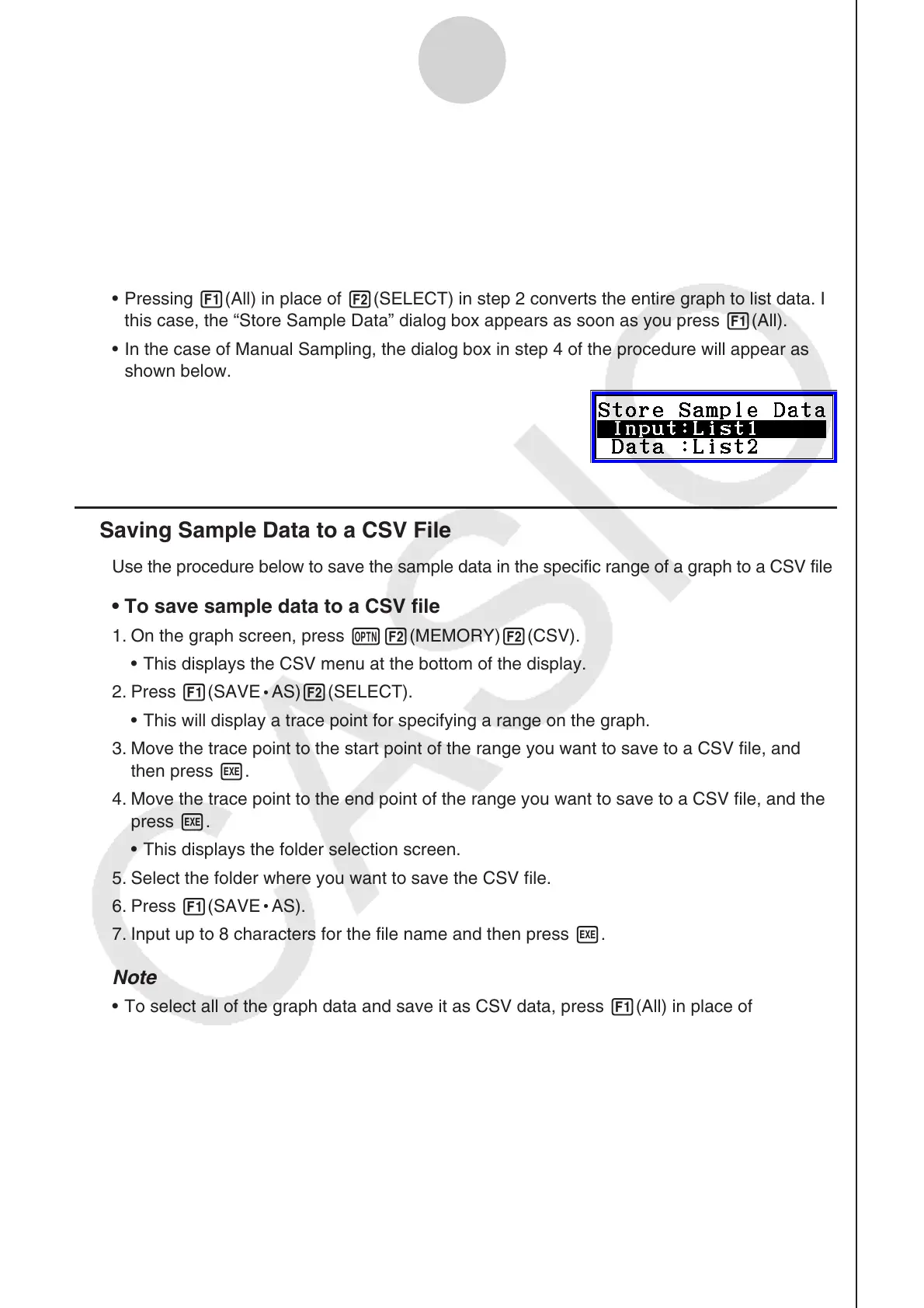 Use the procedure below to save the sample data in the specific range of a graph to a CSV file.