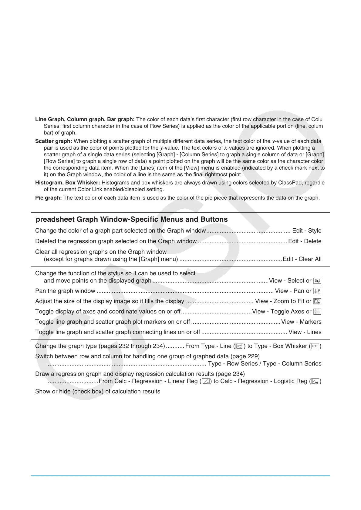 Histogram, Box Whisker: Histograms and box whiskers are always drawn using colors selected by ClassPad, regardless