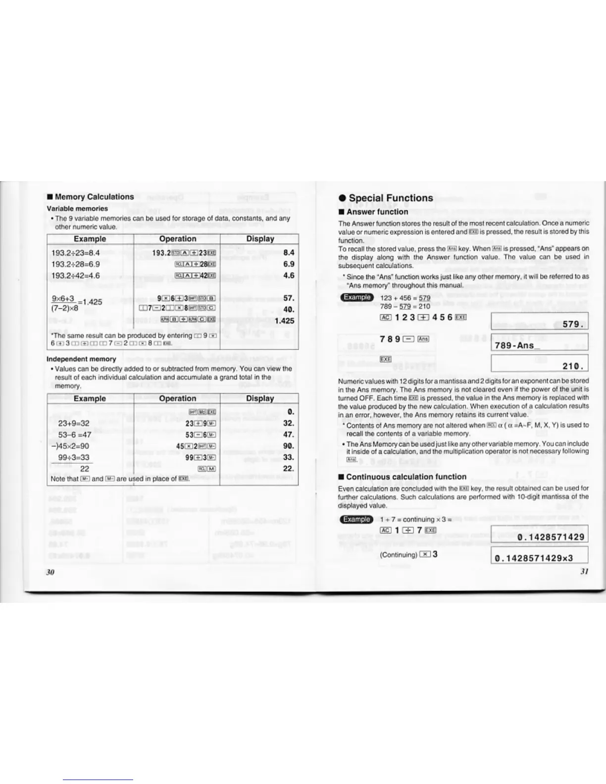 Casio FX-D400 - Memory Calculations; Variable Memories; Independent Memory; Special Functions