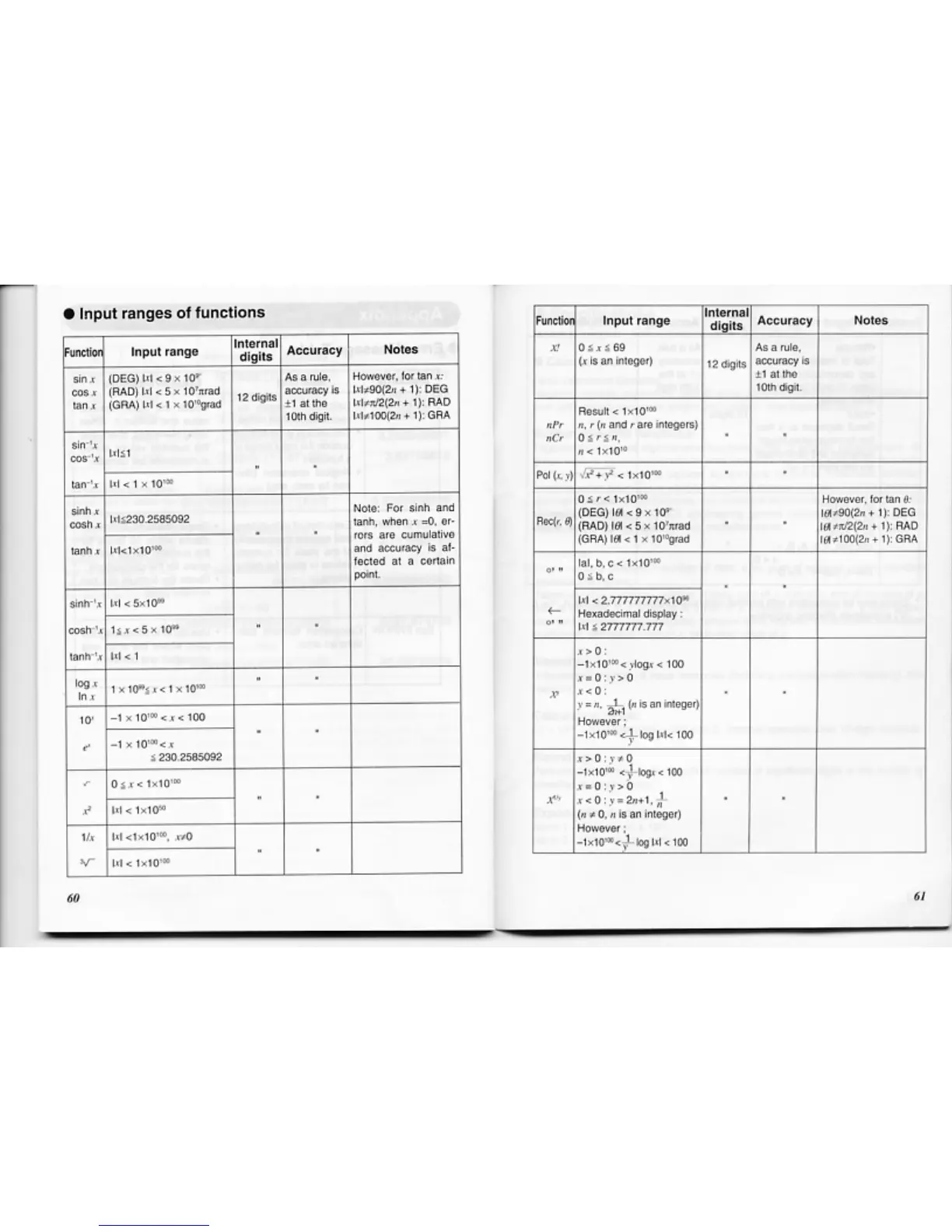 Casio FX-D400 - Function Input Ranges