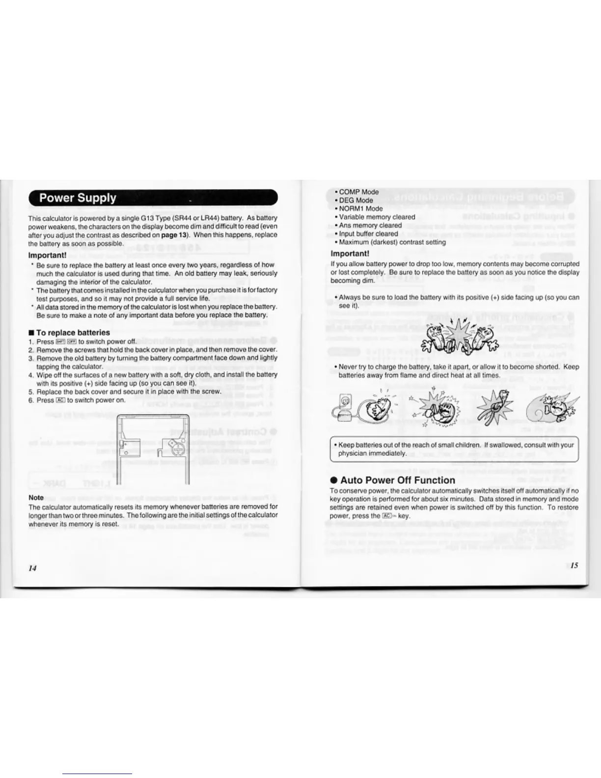 Casio FX-D400 - Power Supply; To Replace Batteries; Auto Power Off Function