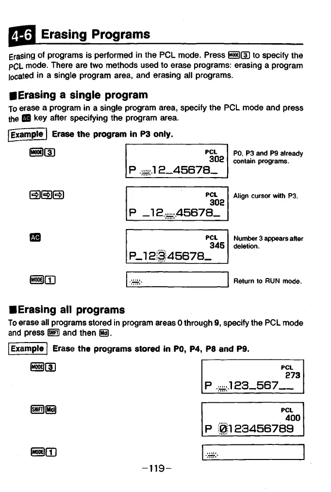 To erase all programs stored in program areas 0 through 9, specify the PCL mode