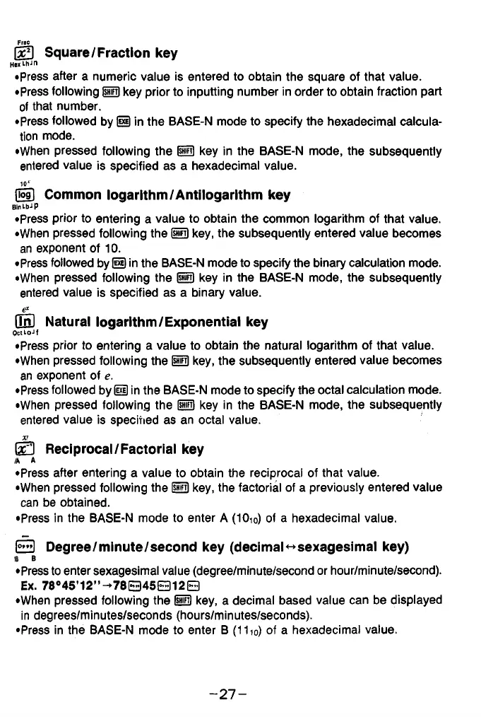 •When pressed following the S key in the BASE-N mode, the subsequently