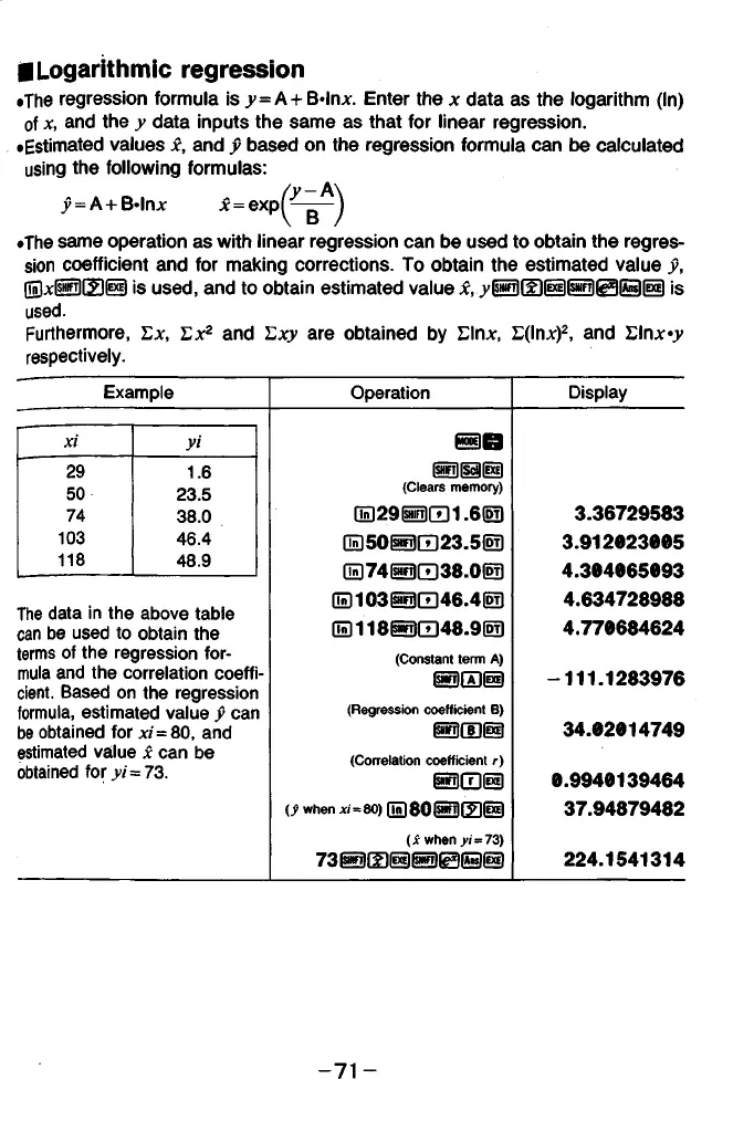 •The regression formula is >>=A + B*lnx. Enter the x data as the logarithm (In)