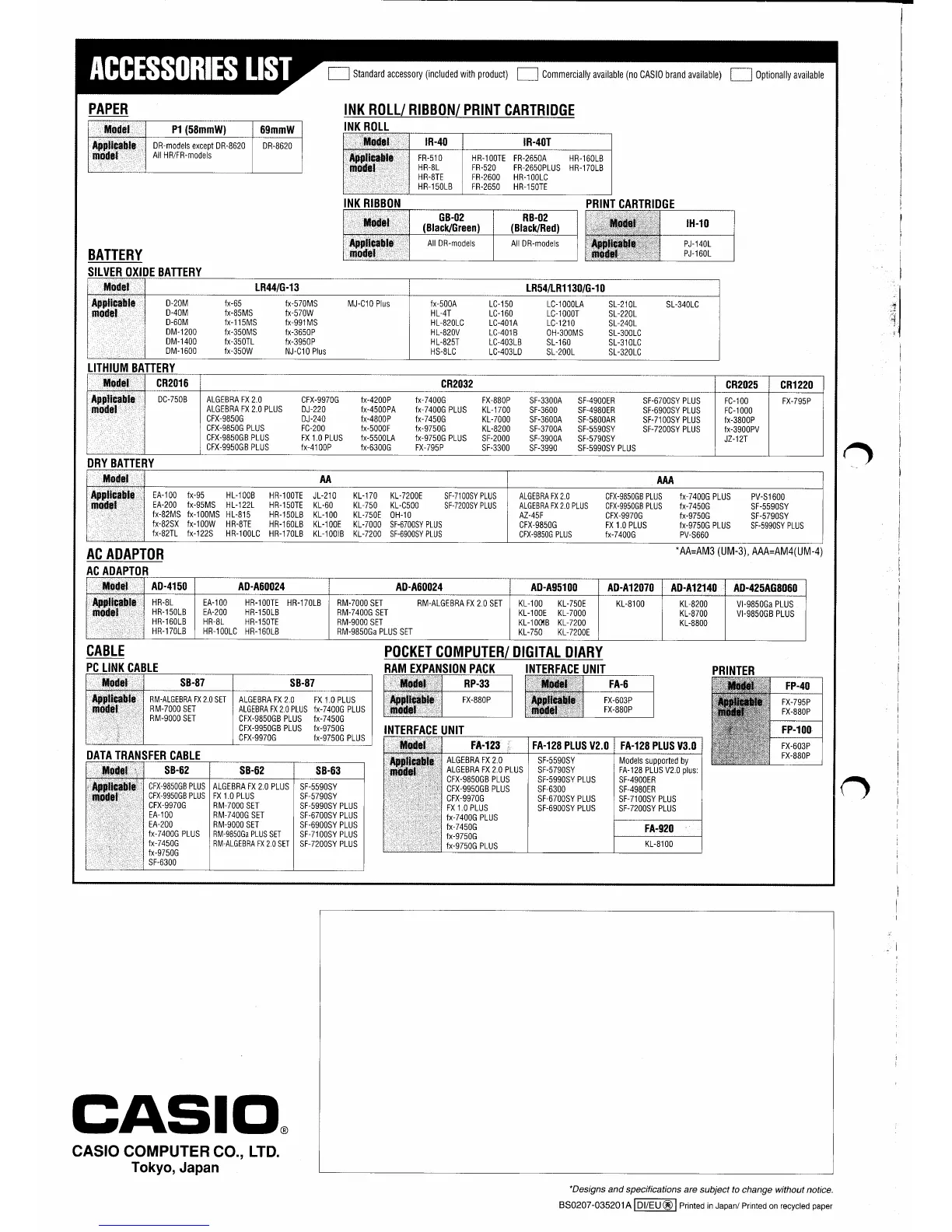 Casio INTERFACE UNIT CONVERSION LIST DIARY - Accessories List