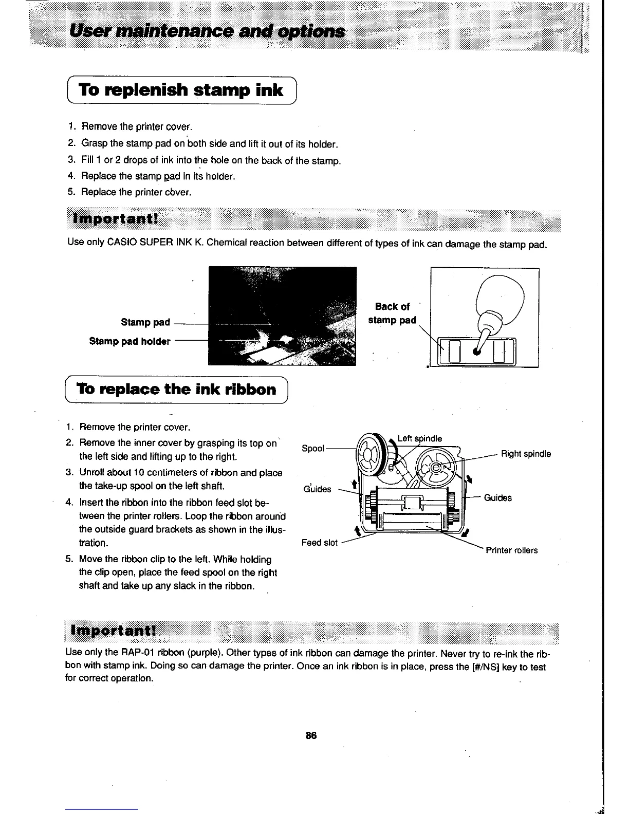 Casio PCR-408 - User Maintenance and Options; Replenishing Stamp Ink; Replacing Ink Ribbon