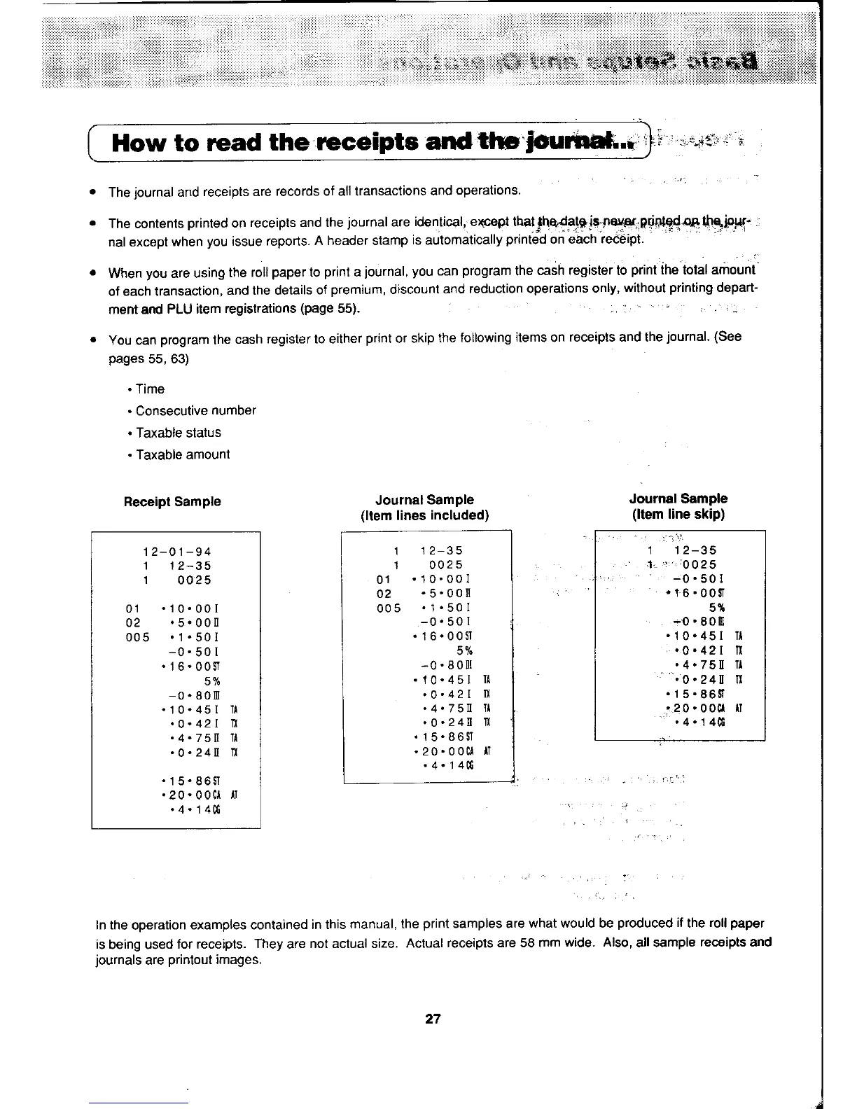 Casio PCR-450 - How to Read the Receipts and the Journal; Receipt Sample; Journal Sample (Item Line Included); Journal Sample (Item Line Skip)