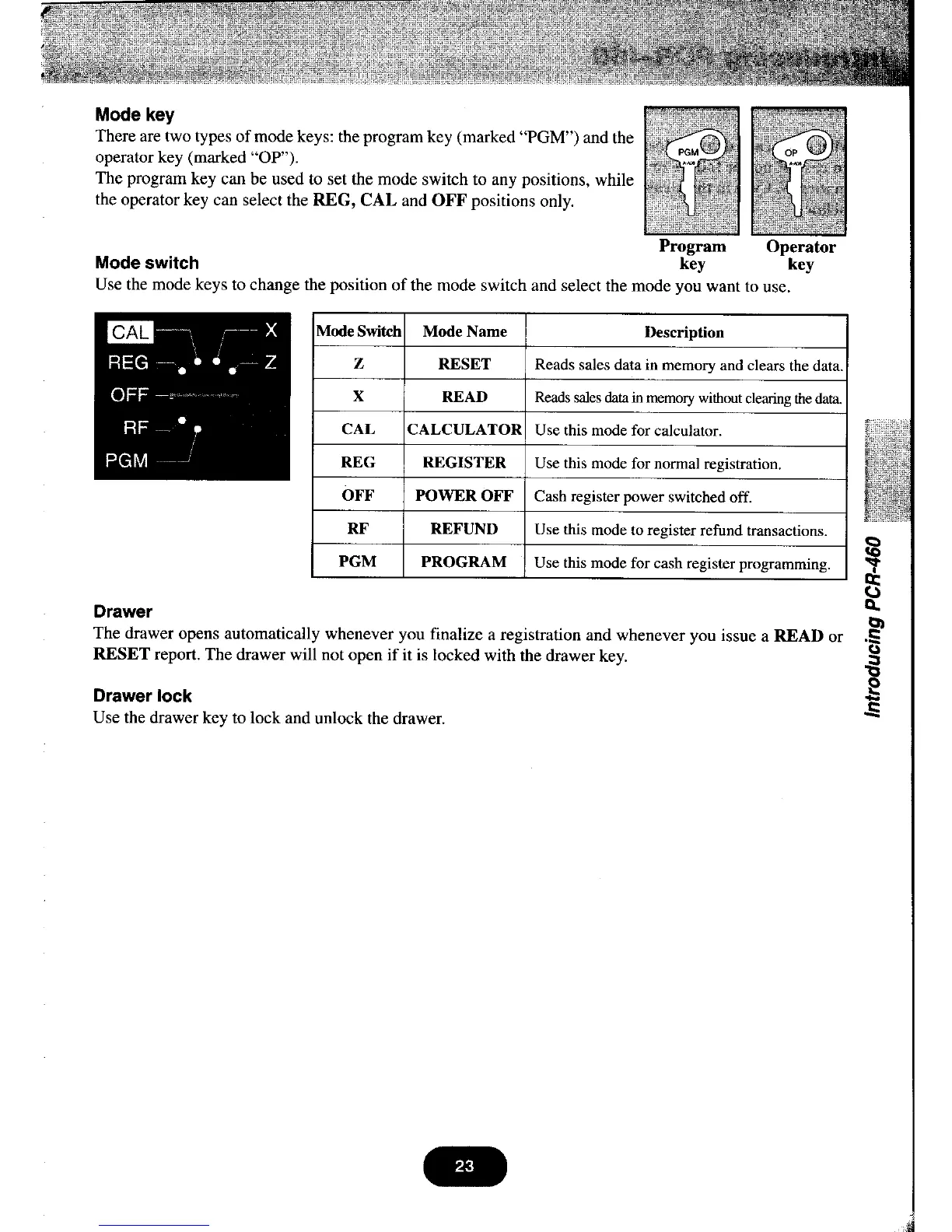 Casio PCR-460 - Mode Key; Mode Switch; Drawer; Drawer Lock