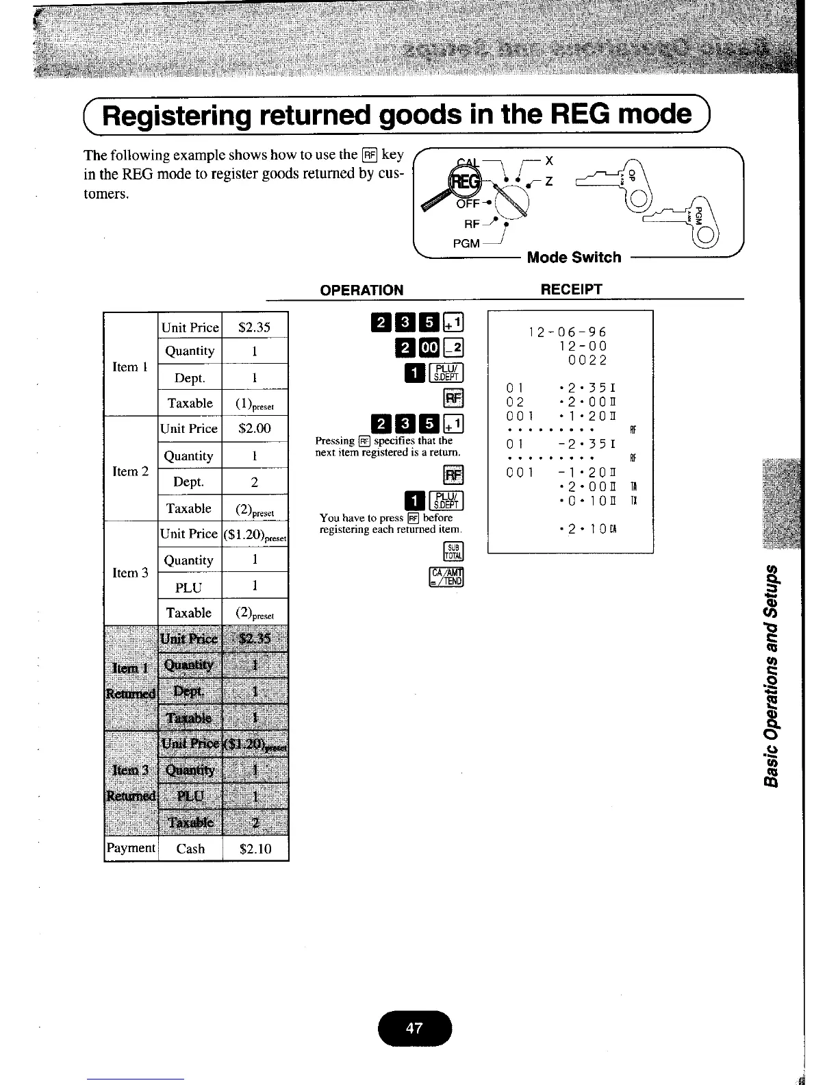 Casio PCR-460 - Registering Returned Goods in the REG Mode