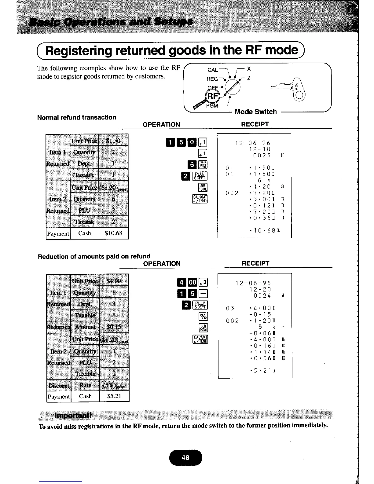 Casio PCR-460 - Registering Returned Goods in the RF Mode; Normal Refund Transaction; Reduction of Amounts Paid on Refund