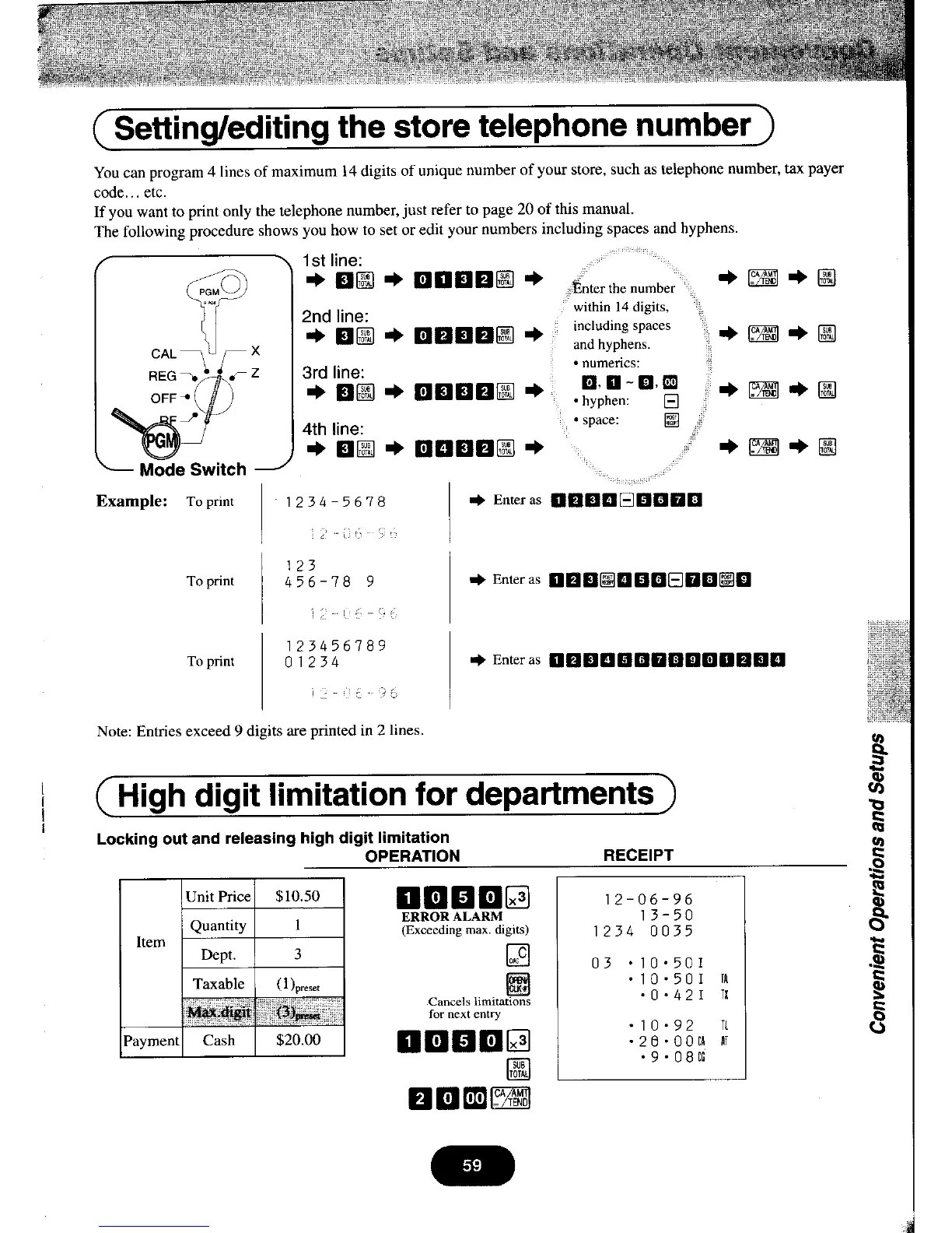 Casio PCR-460 - Setting;Editing the Store Telephone Number; High Digit Limitation for Departments