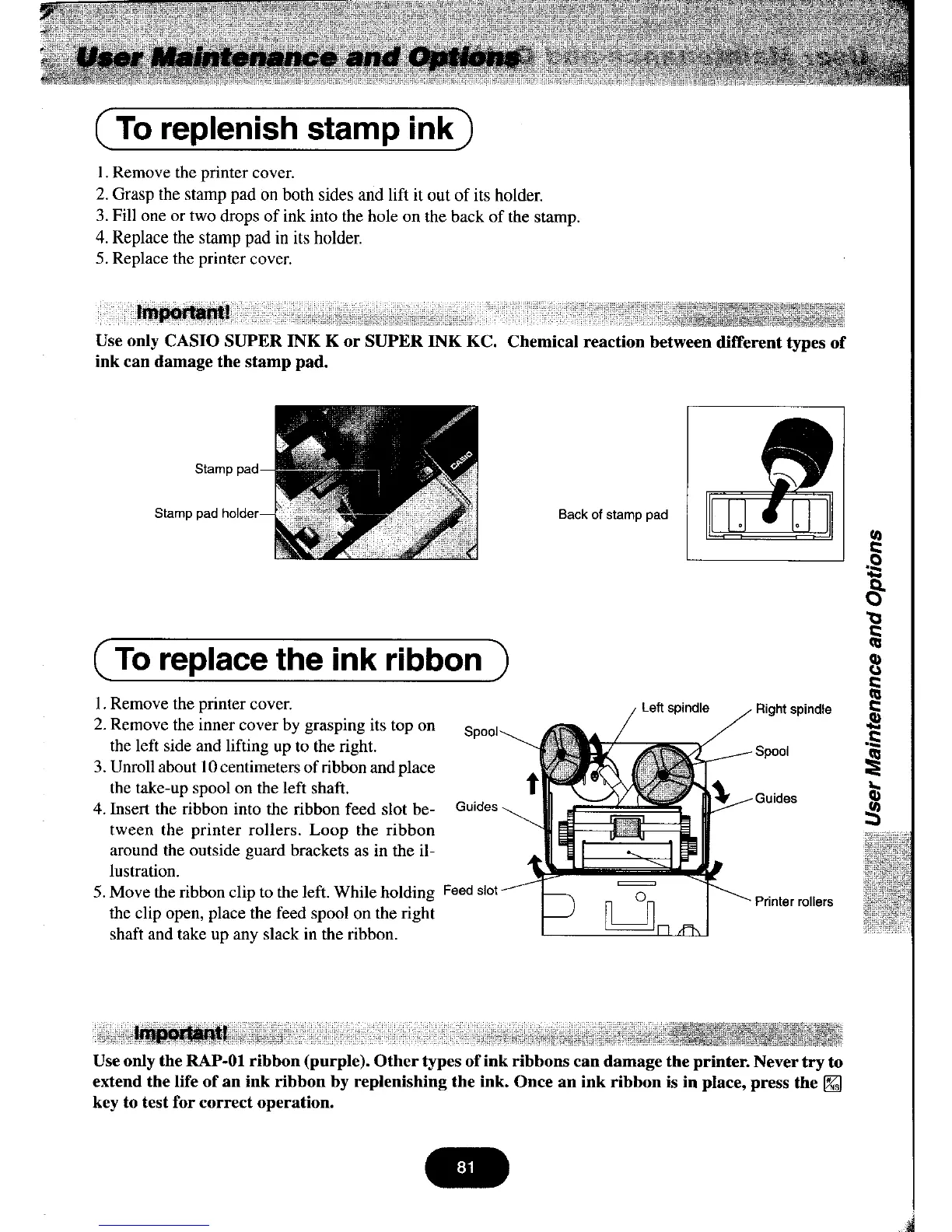 Casio PCR-460 - User Maintenance and Options; To Replenish Stamp Ink; To Replace the Ink Ribbon