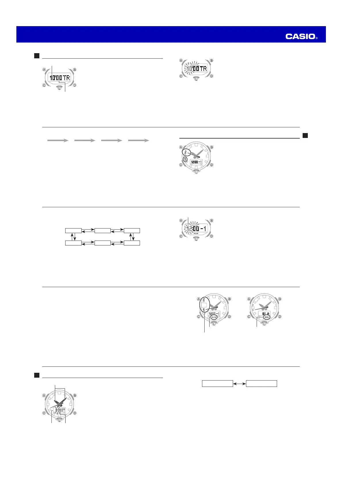 x Each press of D or B cycles between the alarm time screen and the hourly