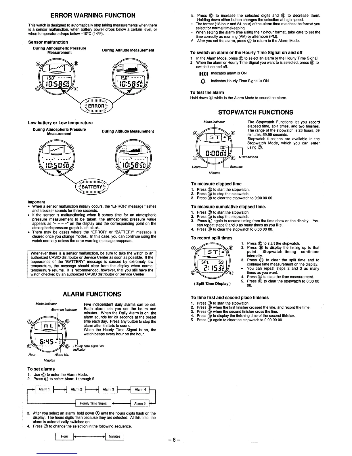 Casio QW-950-98 - Error Warning Function; Stopwatch Functions; Alarm Functions; Sensor Malfunction