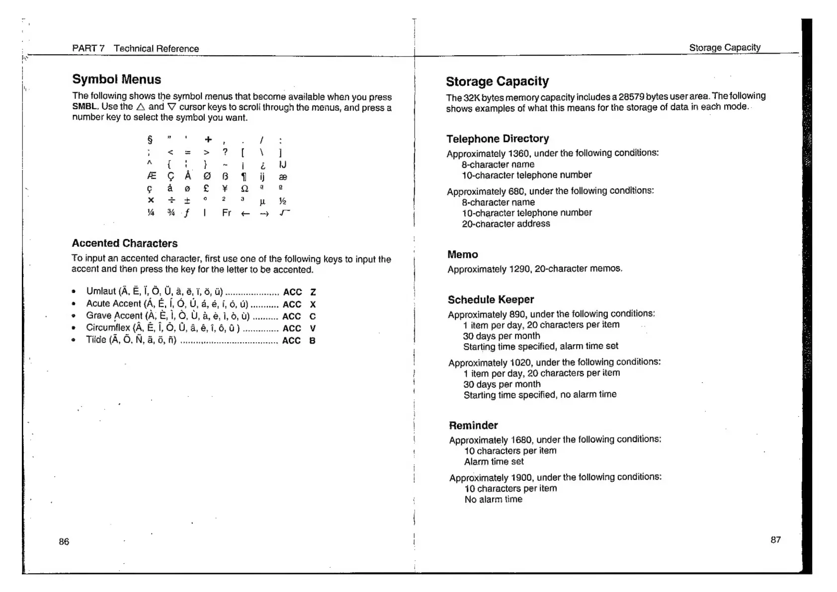 Casio SF-4300B - Symbol Menus; Accented Characters; Storage Capacity