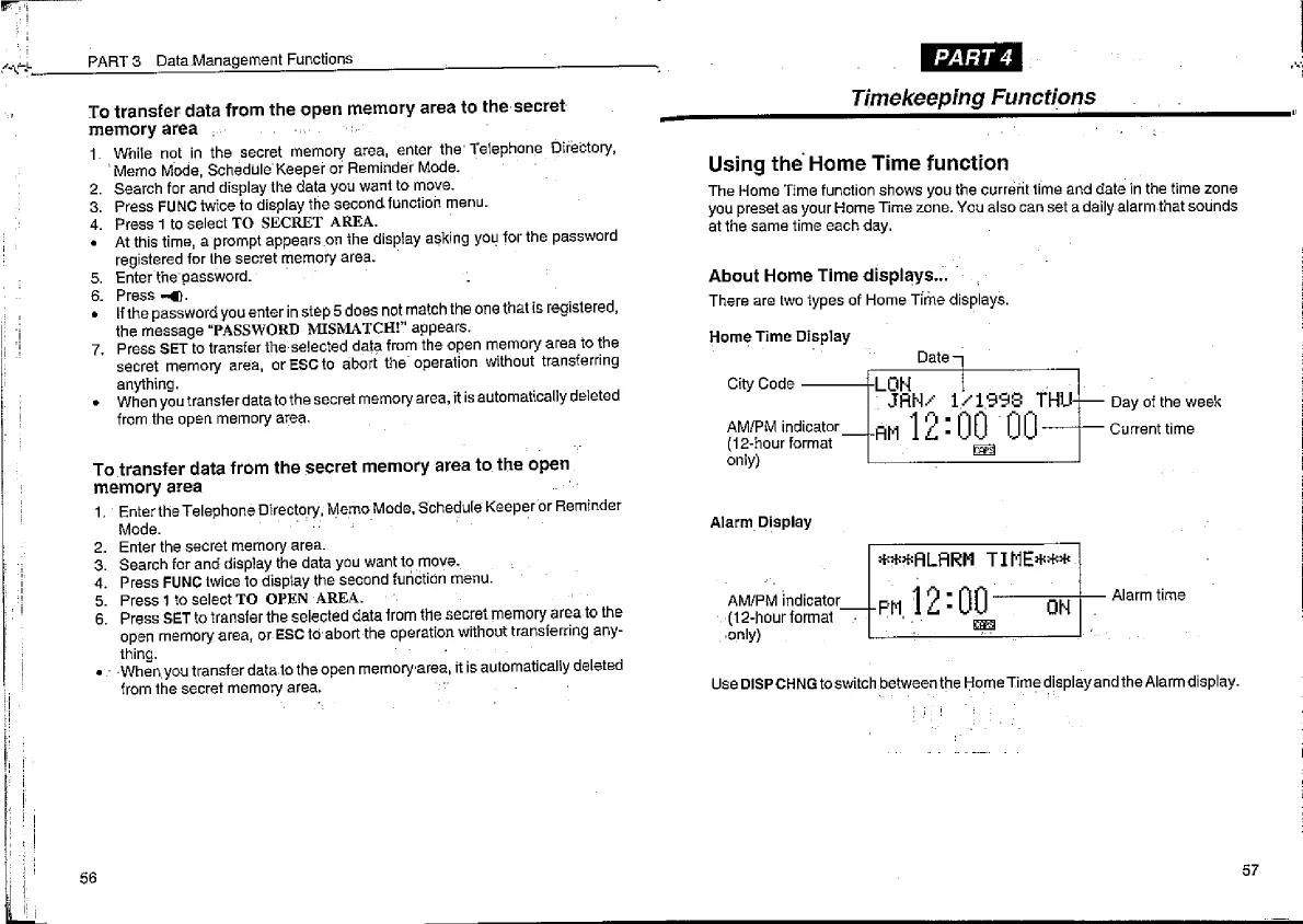 Casio SF-4700C - To transfer data from the open memory area to the secret memory area; Timekeeping Functions; Using the Home Time function
