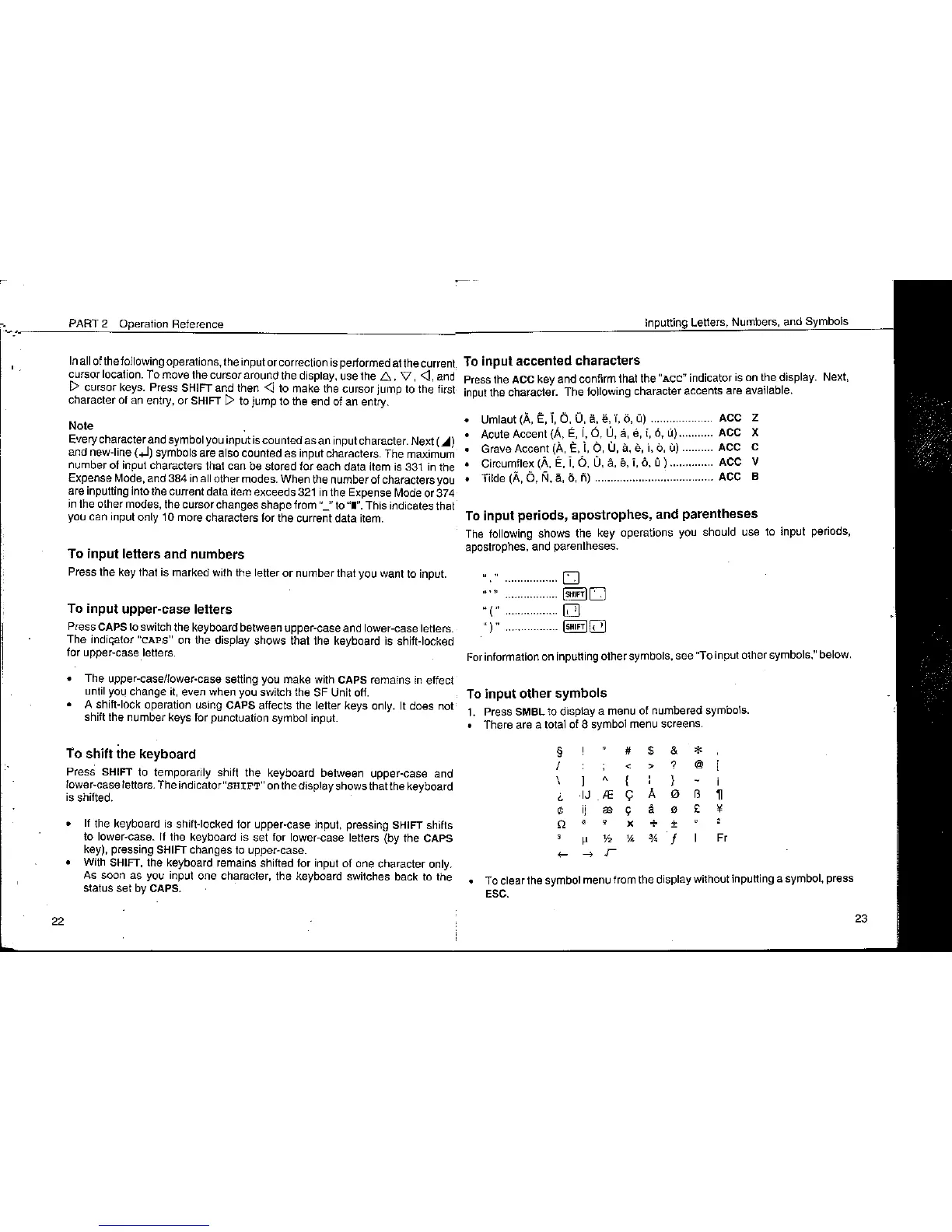 Casio SF-5300E - To Input Upper-Case Letters; To Shift the Keyboard; To Input Accented Characters; To Input Periods, Apostrophes and Parentheses