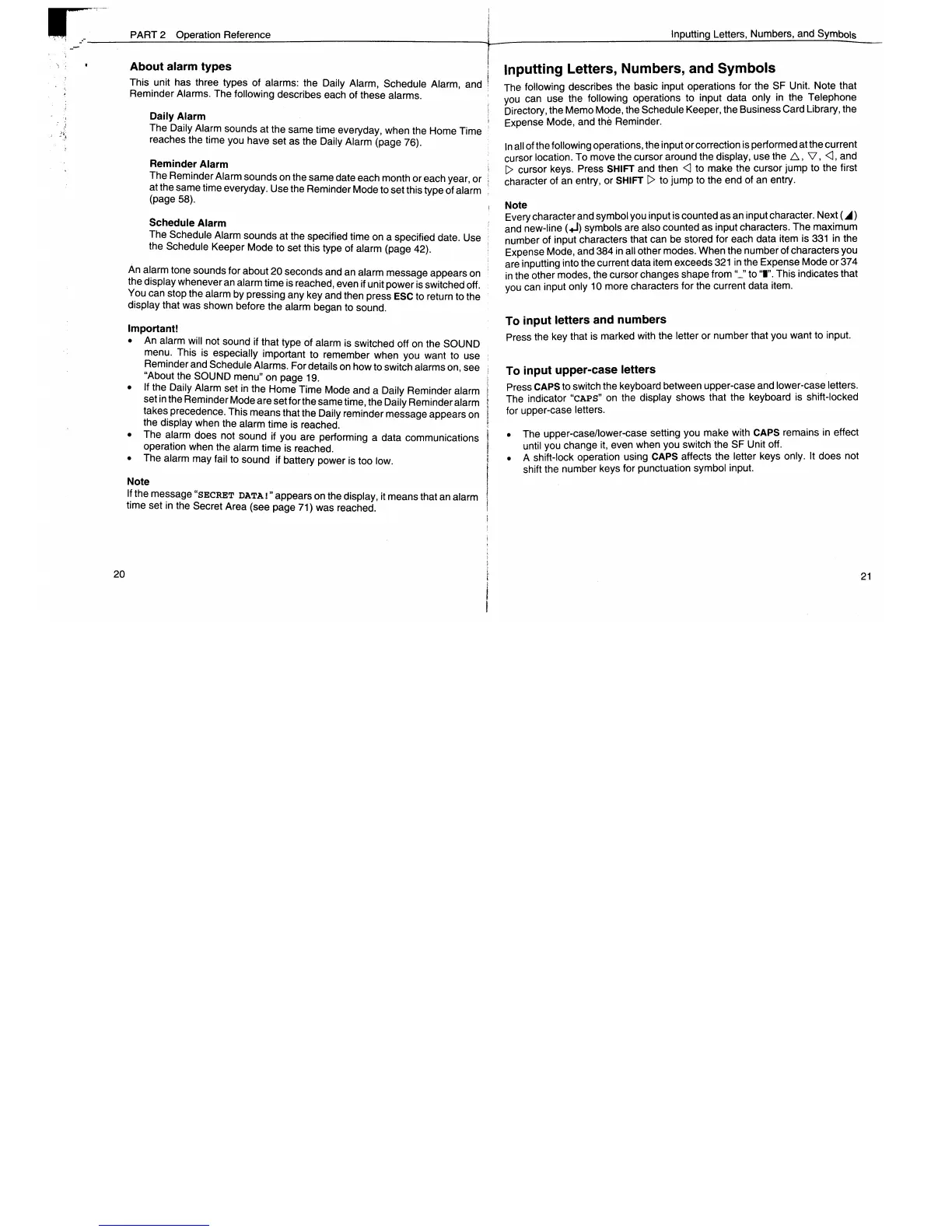 Casio SF-7900 - About Alarm Types; Inputting Letters, Numbers, and Symbols; To Input Letters and Numbers; To Input Upper-Case Letters