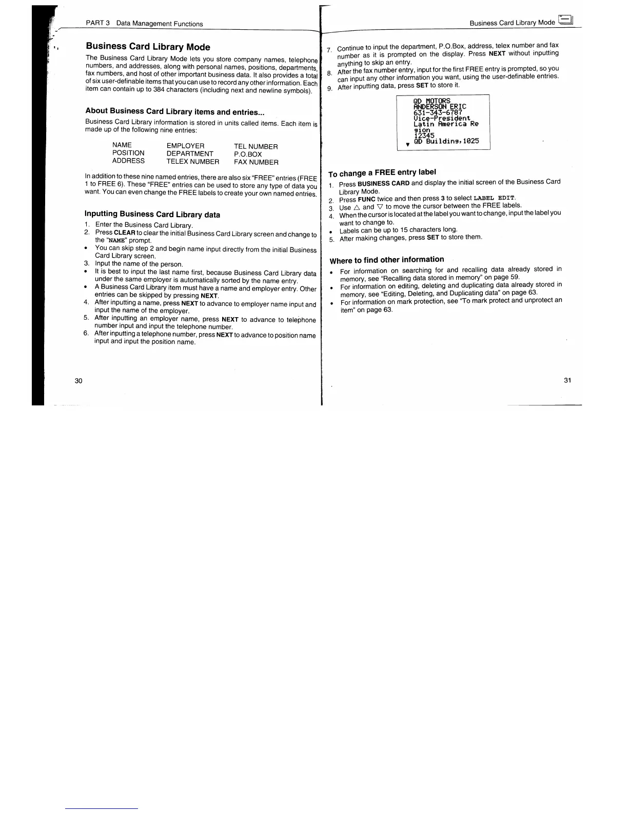 Casio SF-7900 - Business Card Library Mode; Inputting Business Card Library Data