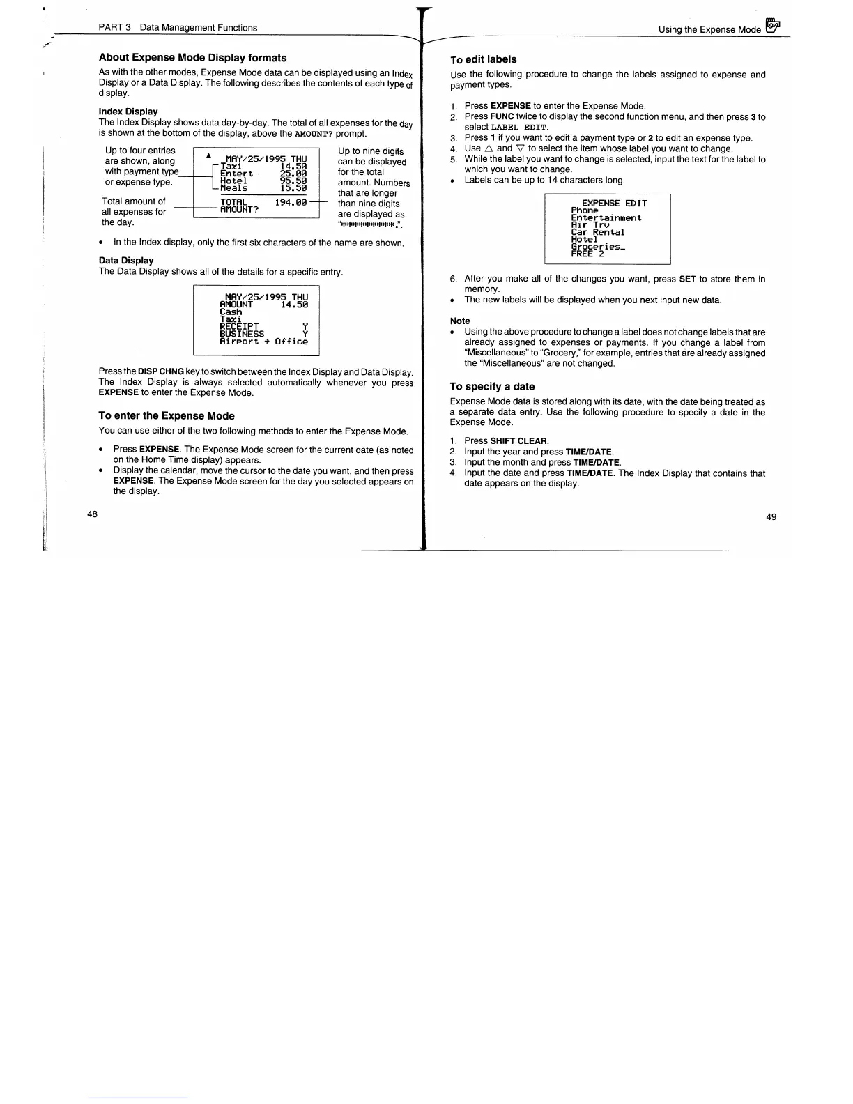 Casio SF-7900 - About Expense Mode Display Formats; To Enter the Expense Mode; To Edit Labels