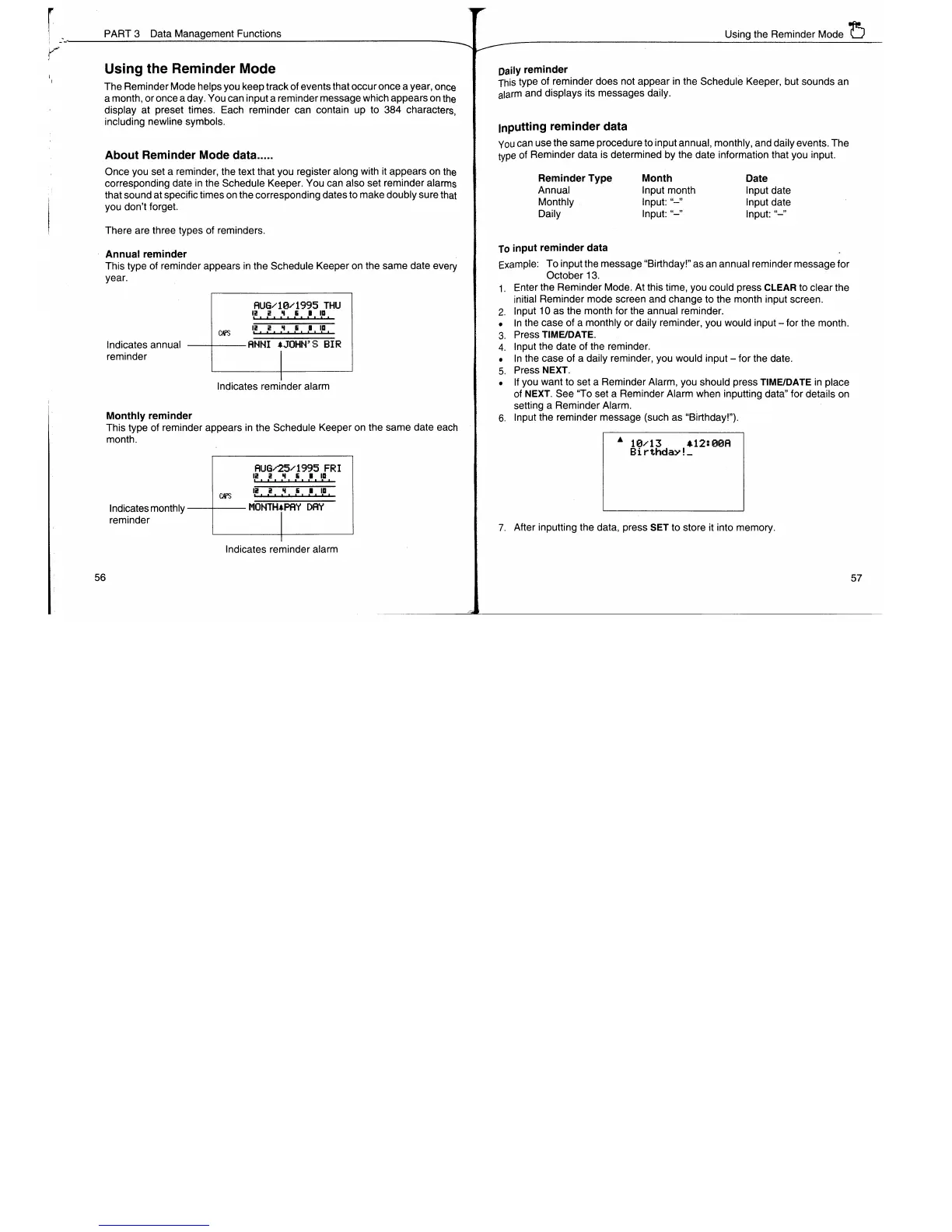 Casio SF-7900 - Using the Reminder Mode; About Reminder Mode Data; Annual Reminder; Monthly Reminder