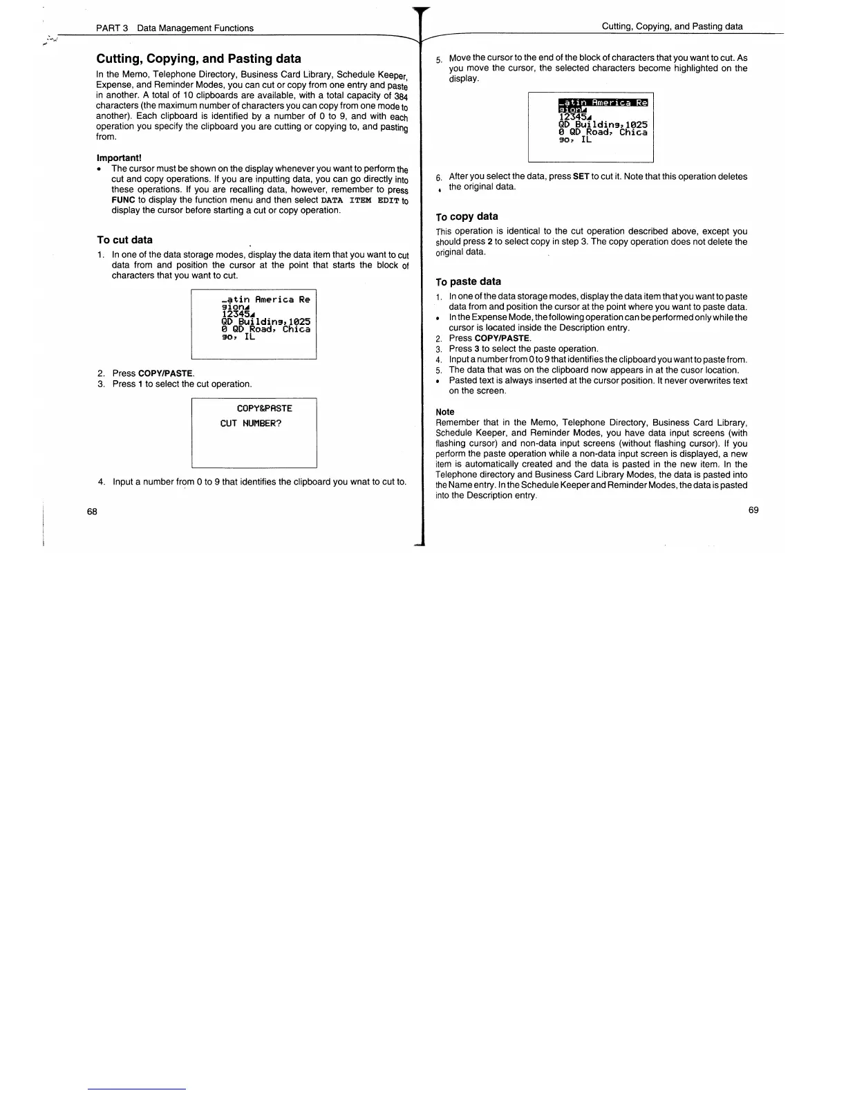 Casio SF-7900 - Cutting, Copying and Pasting Data; To Cut Data; To Copy Data; To Paste Data
