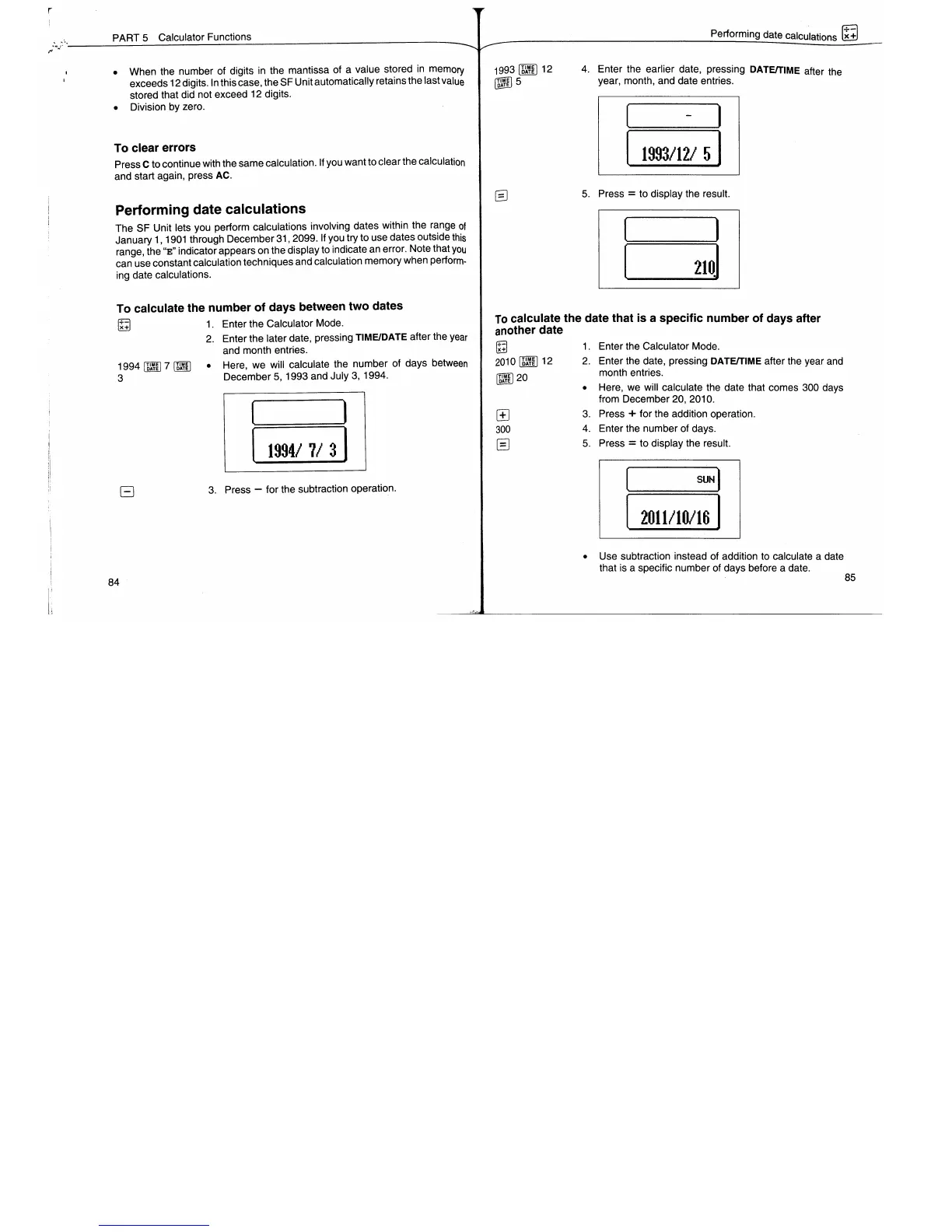 Casio SF-7900 - Performing Date Calculations; To Clear Errors