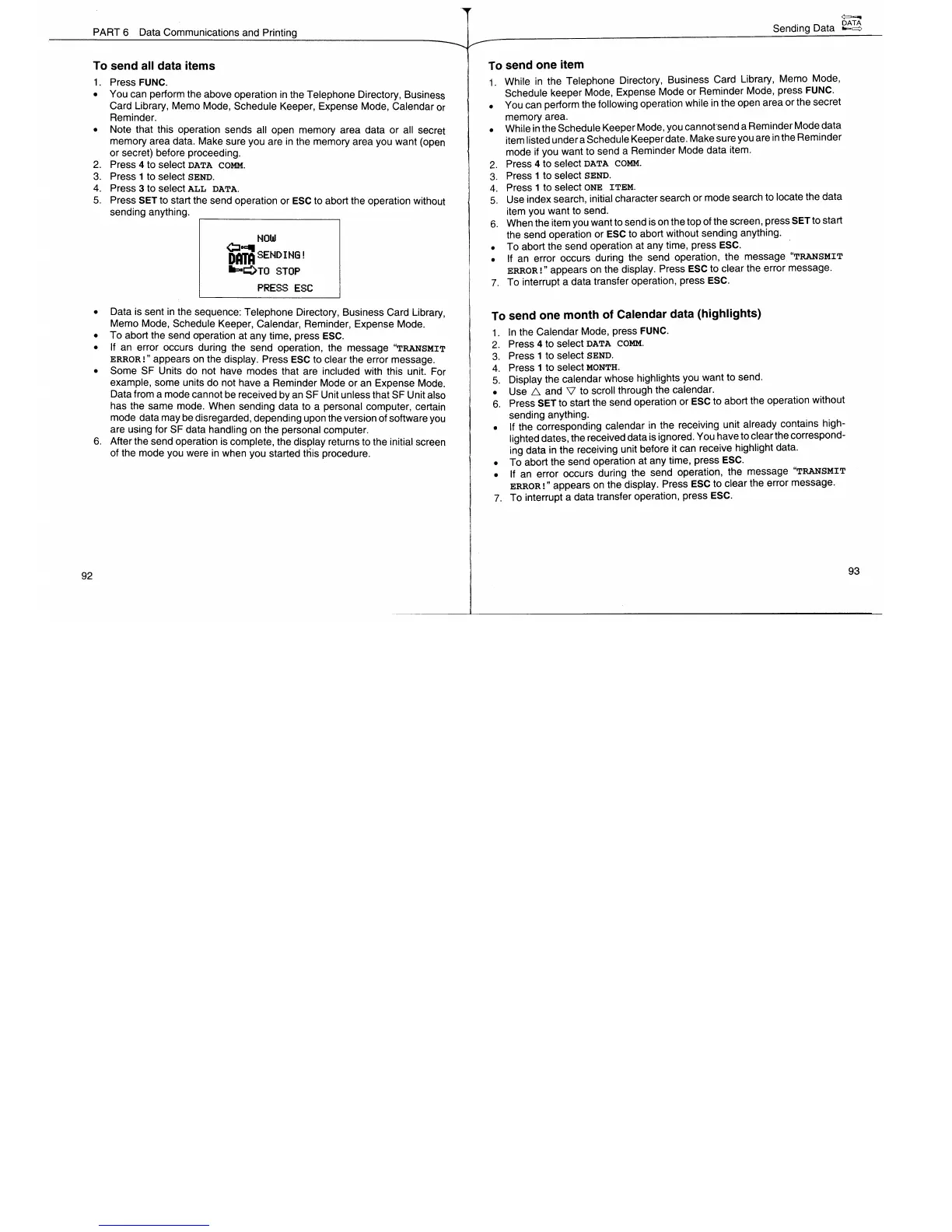 Casio SF-7900 - To Send All Data Items; To Send One Item; To Send One Month of Calendar Data