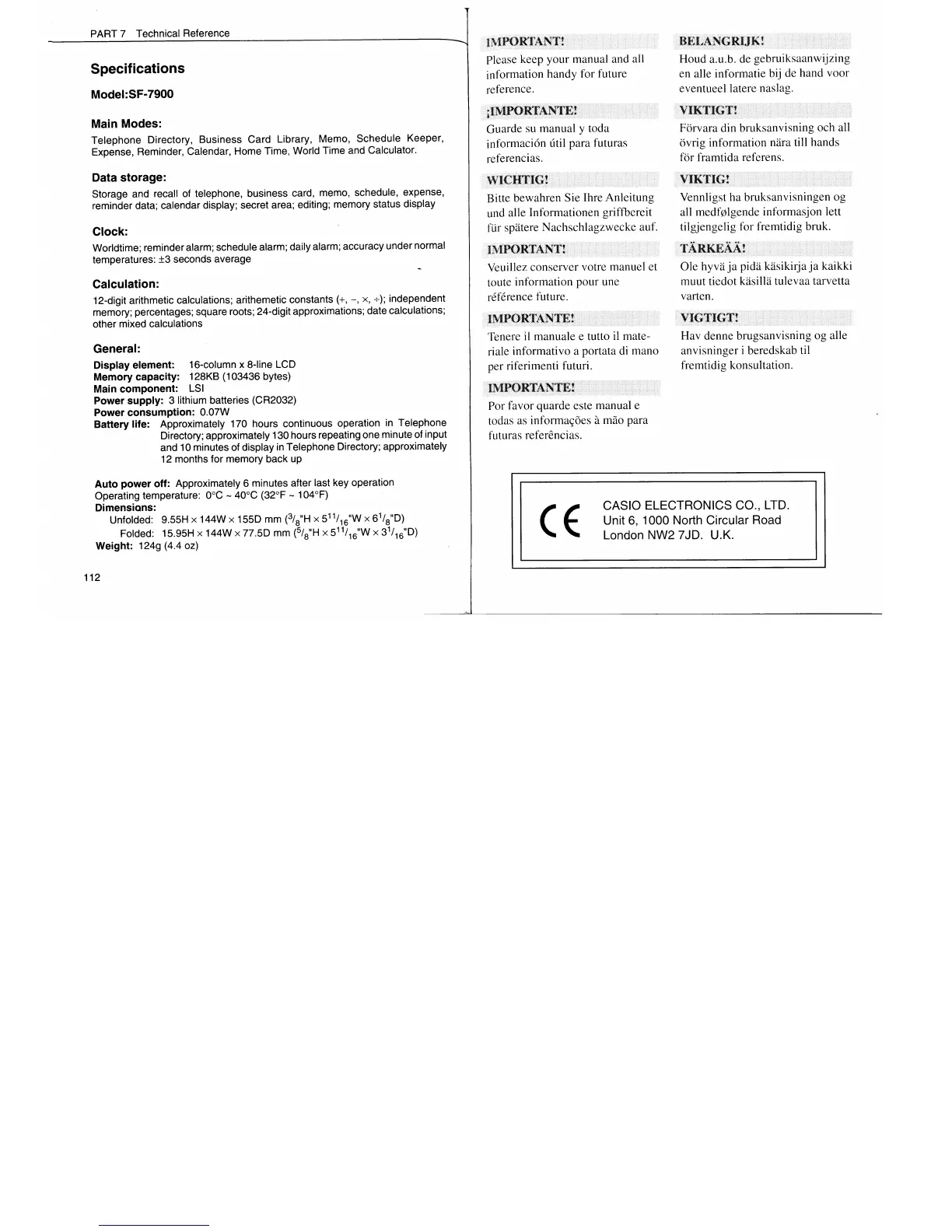 Casio SF-7900 - Specifications; Main Modes; Data Storage; Clock
