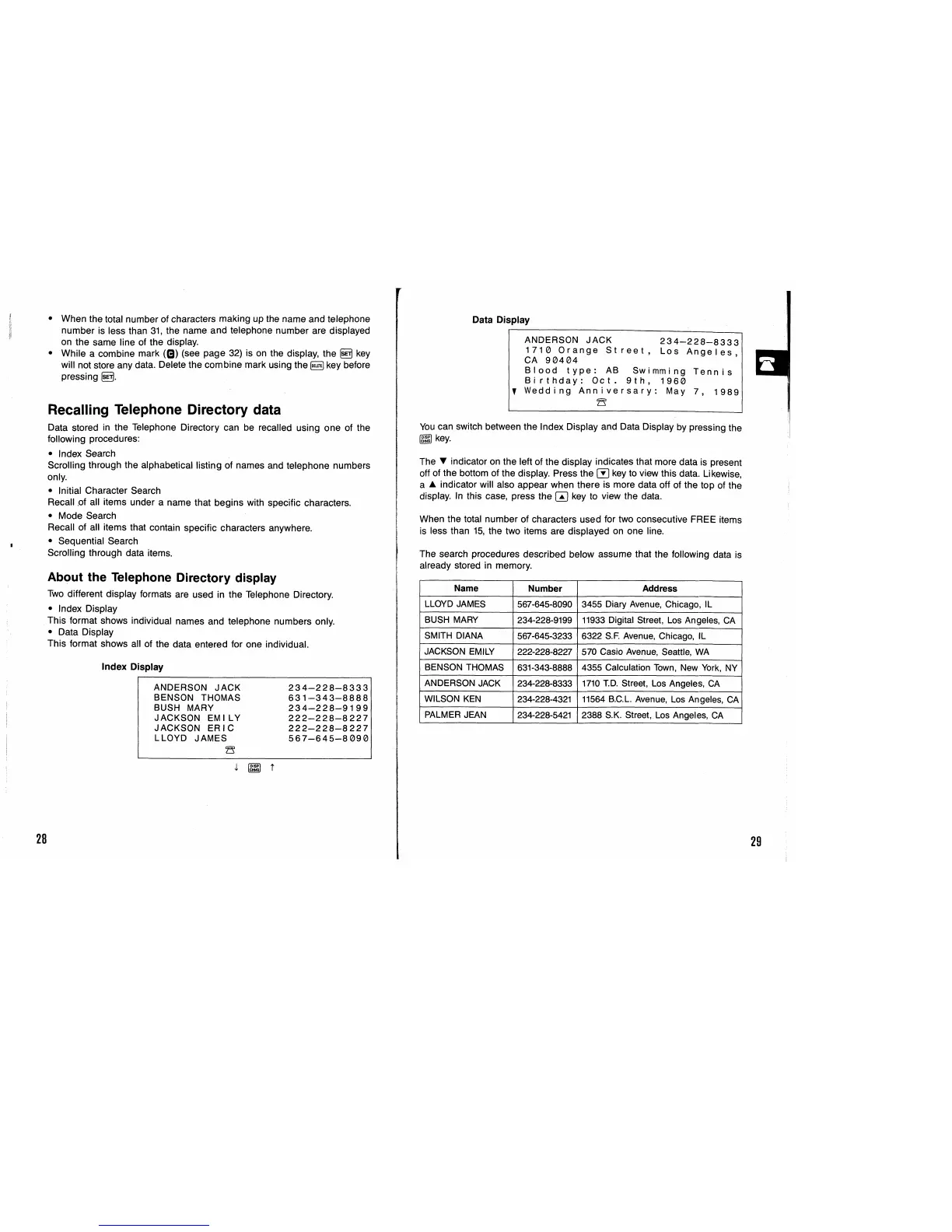 Casio SF-9350 - Recalling Telephone Directory Data; About the Telephone Directory Display; Data Display