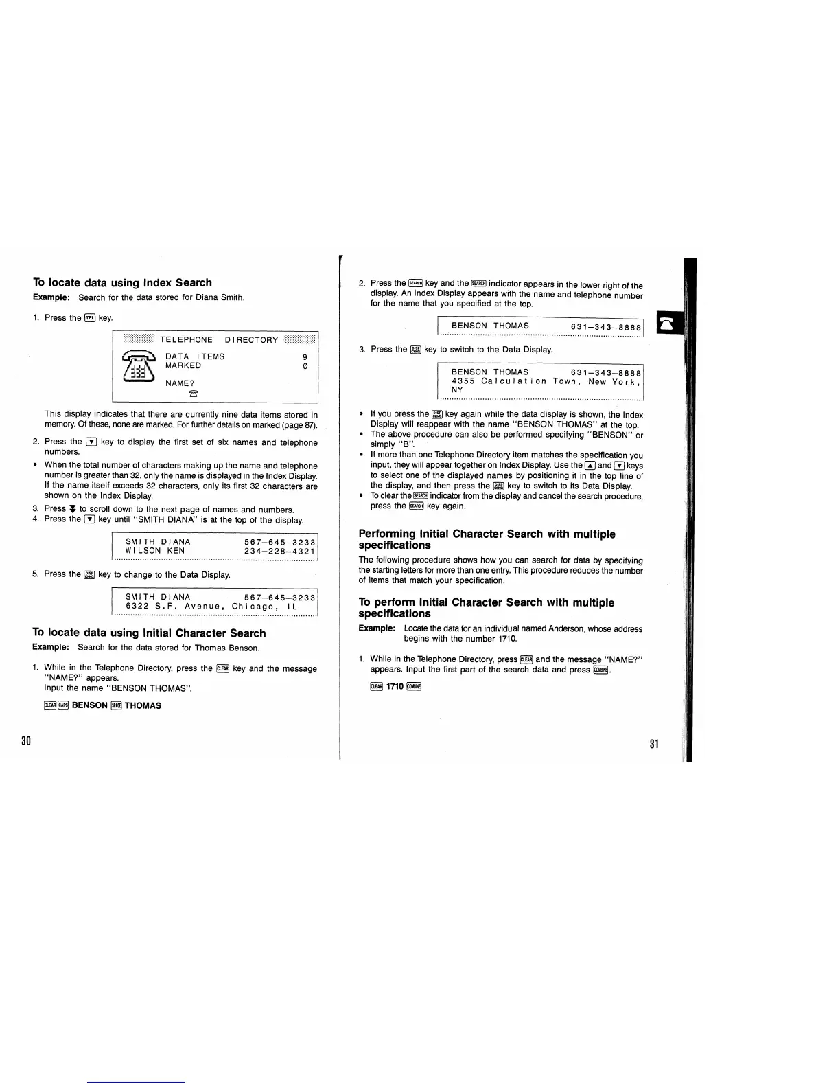 Casio SF-9350 - To Locate Data Using Index Search; To Locate Data Using Character Search; Performing Initial Character Search with Multiple Specifications