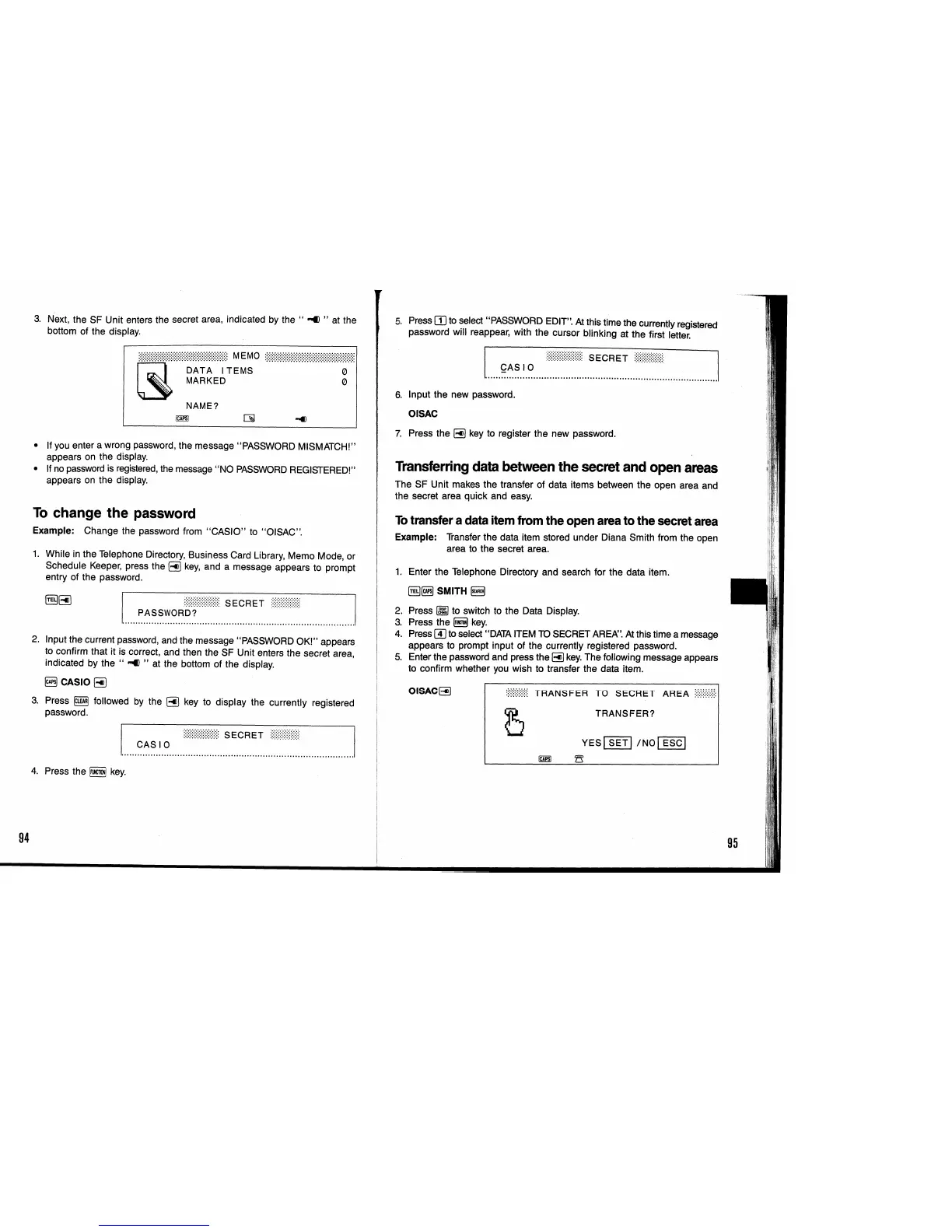 Casio SF-9350 - To Change the Password; Transferring Data between the Secret and Open Areas