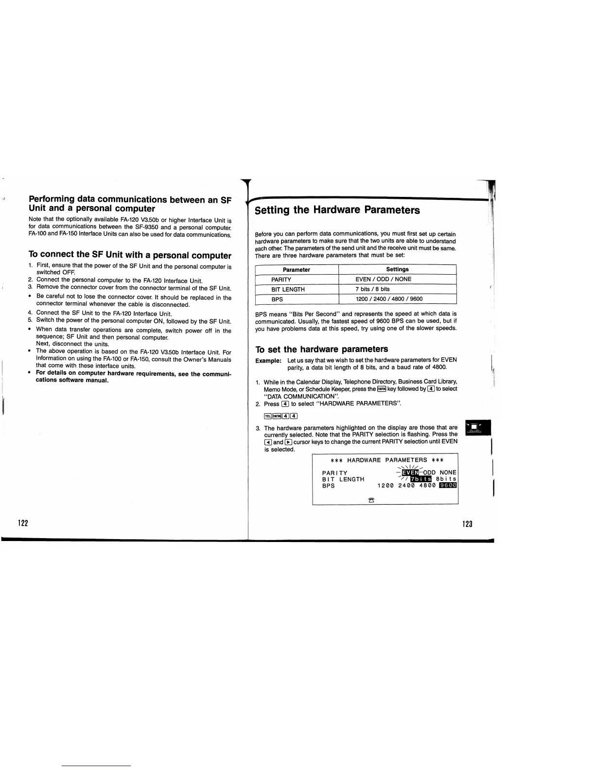 Casio SF-9350 - Setting the Hardware Parameters; To Connect the SF Unit with a Personal Computer; To Set the Hardware Parameters