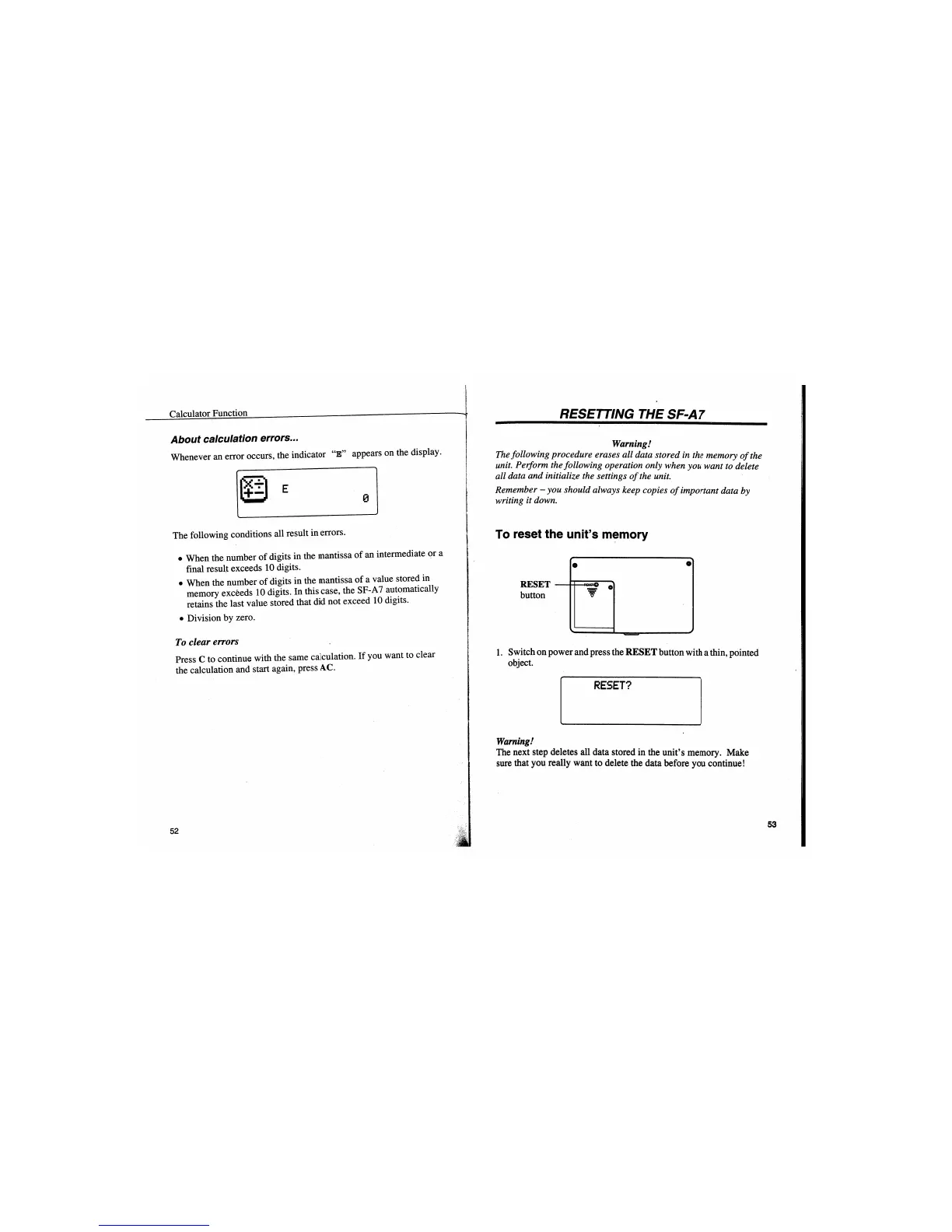 Casio SF-A7 - Resetting the SF-A7; Resetting Unit Memory; Warning: Data Loss During Reset