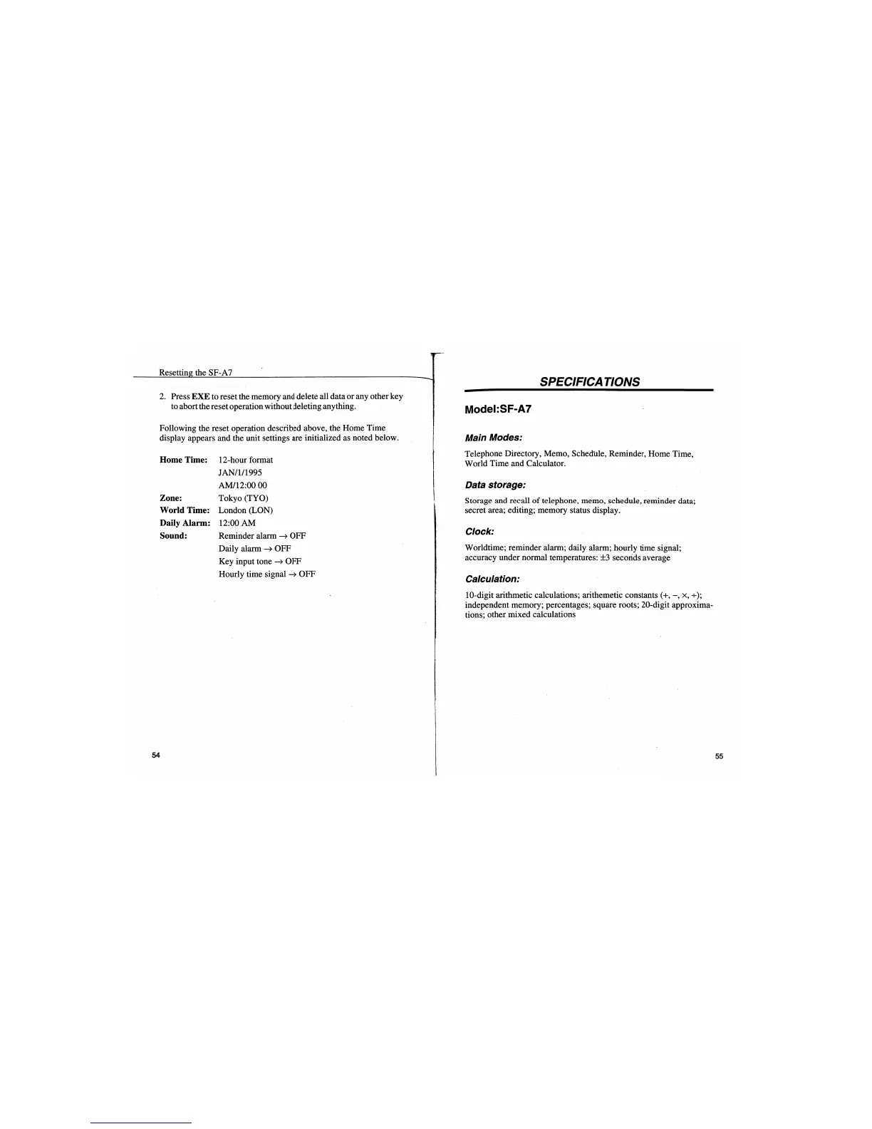 Casio SF-A7 - Specifications Overview; Main Modes; Data Storage Capabilities; Clock Features and Accuracy