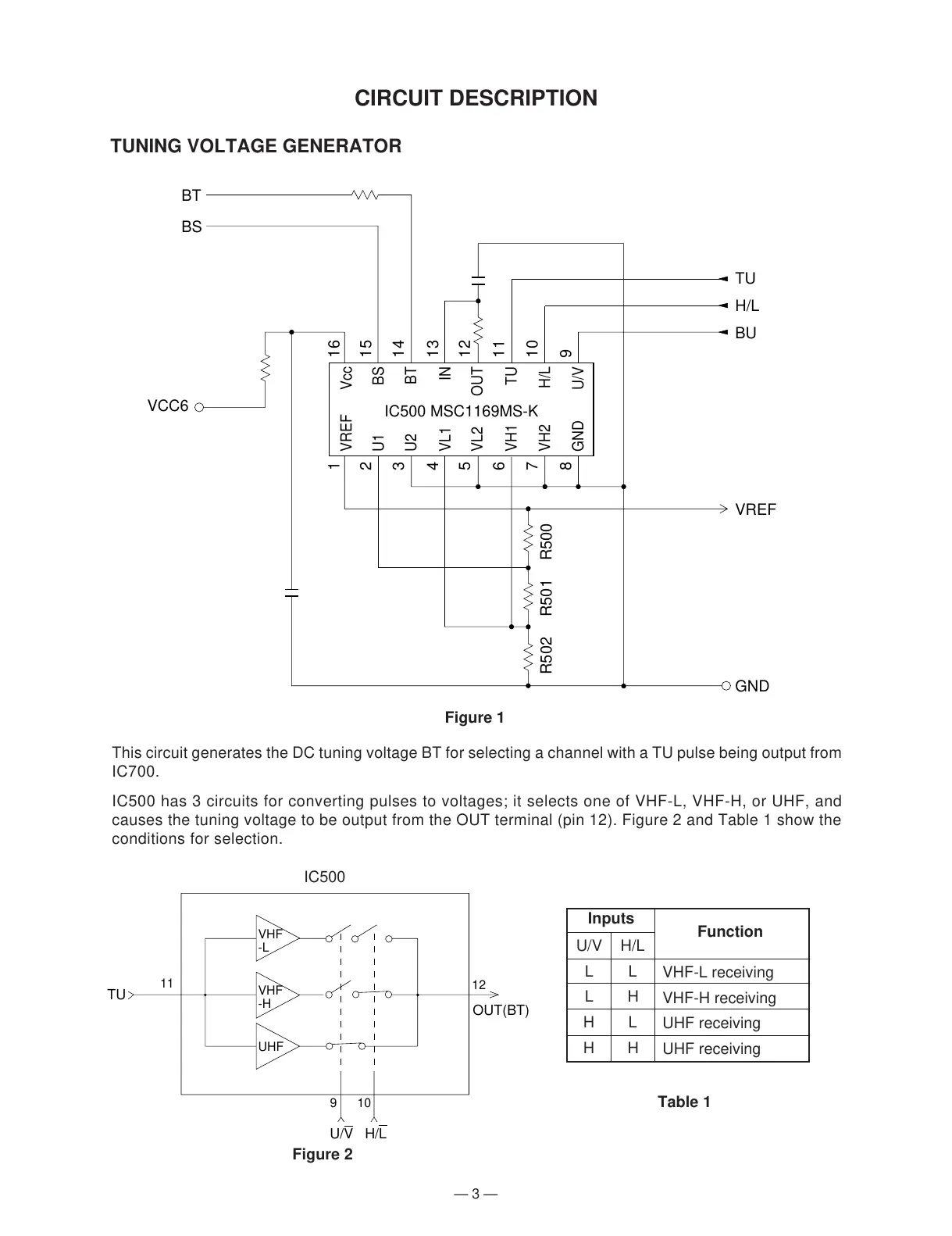 causes the tuning voltage to be output from the OUT terminal (pin 12). Figure 2 and Table 1 show the