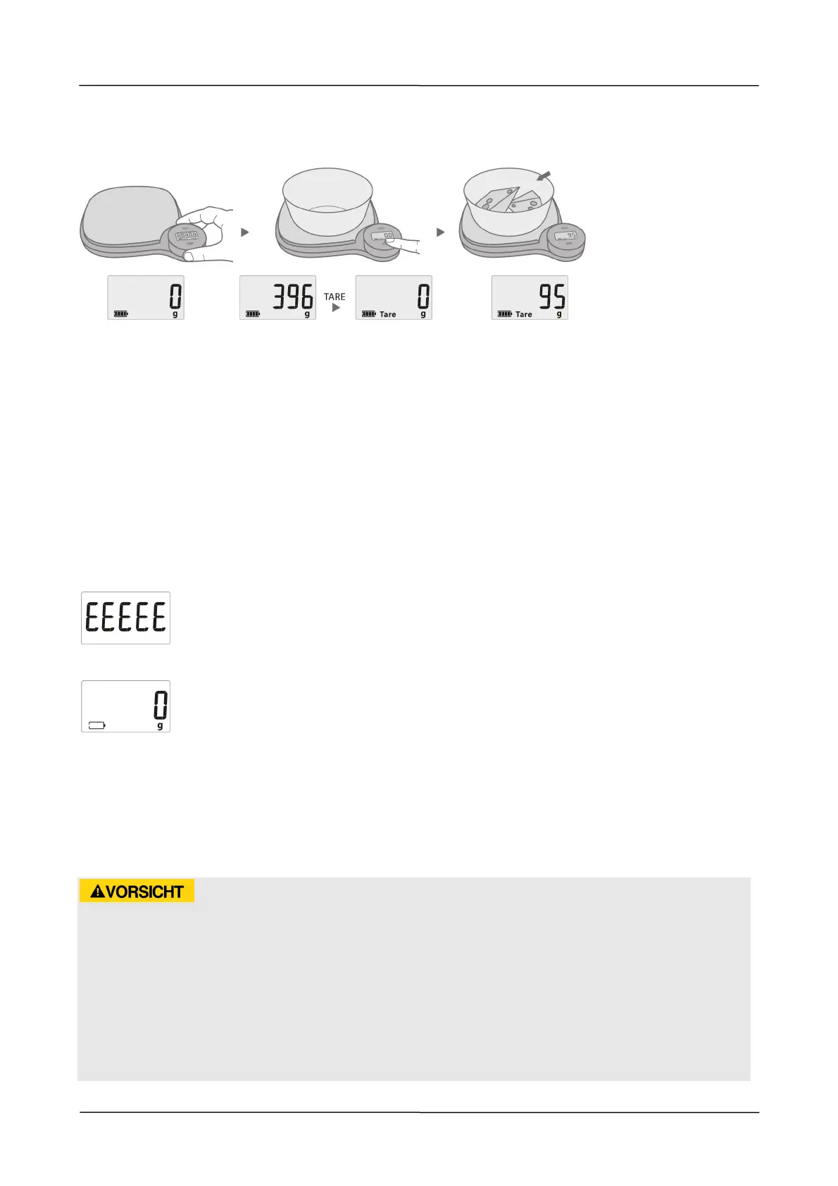 Place an empty container on the scale. The display will now show the weight of the