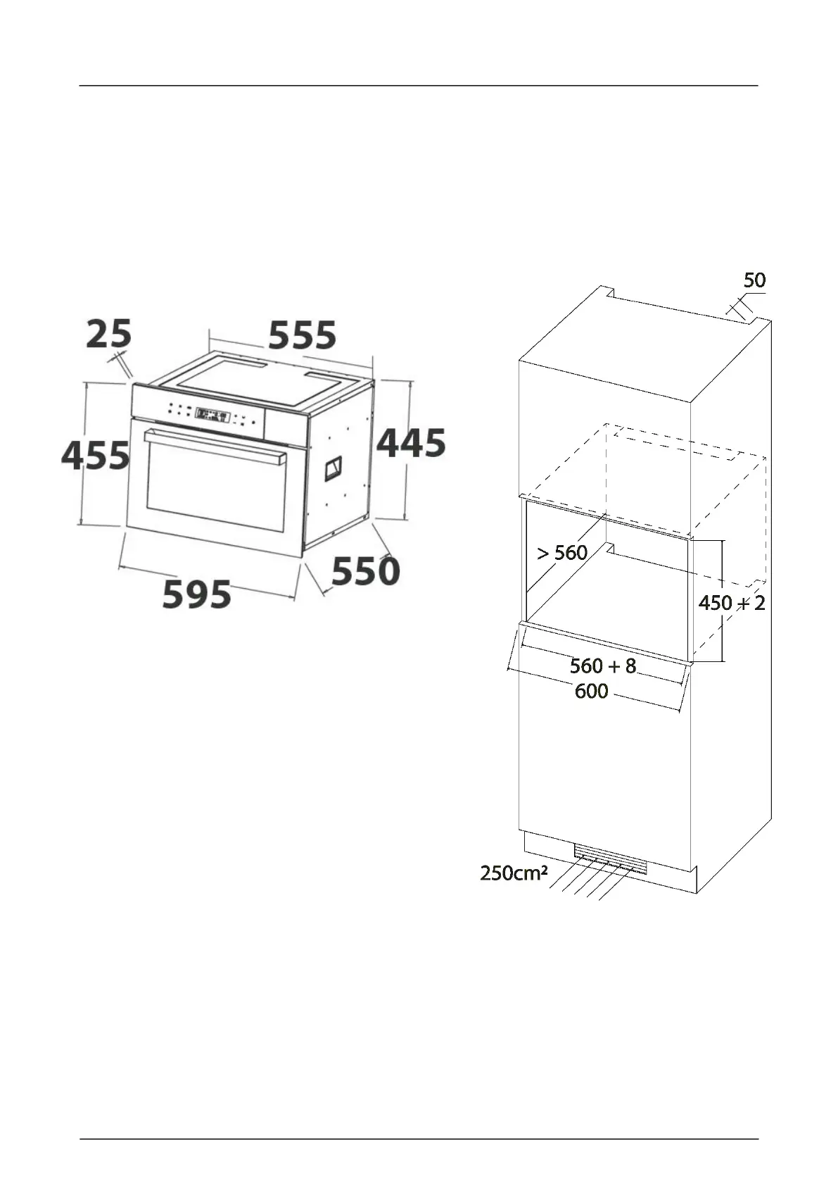 L'appareil peut être installé dans une armoire murale encastrée de 600 mm de large.