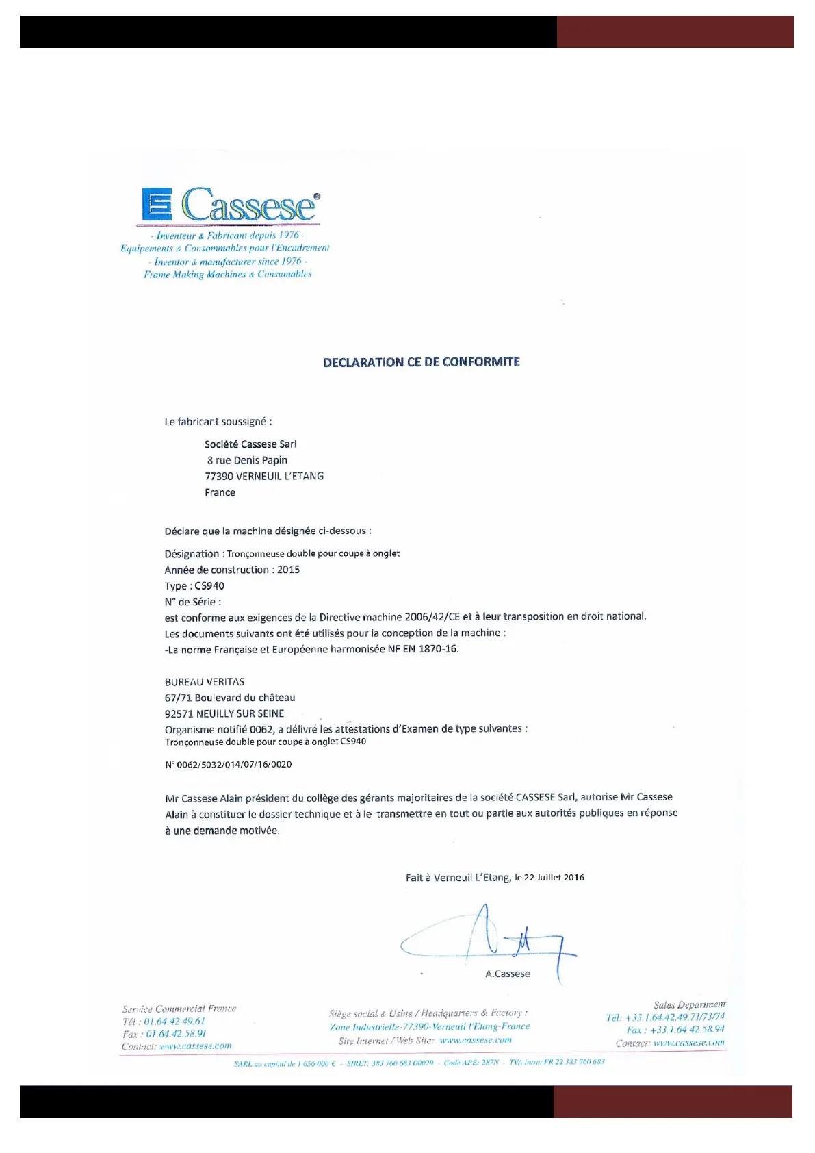 V. CERTIFICATE / CERTIFICAT DE CONFORMITE