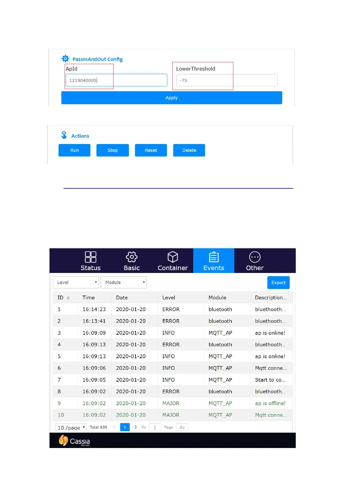 Module (Web, Bluetooth, MQTT, WTP, Network, etc.). The user can click the Export button