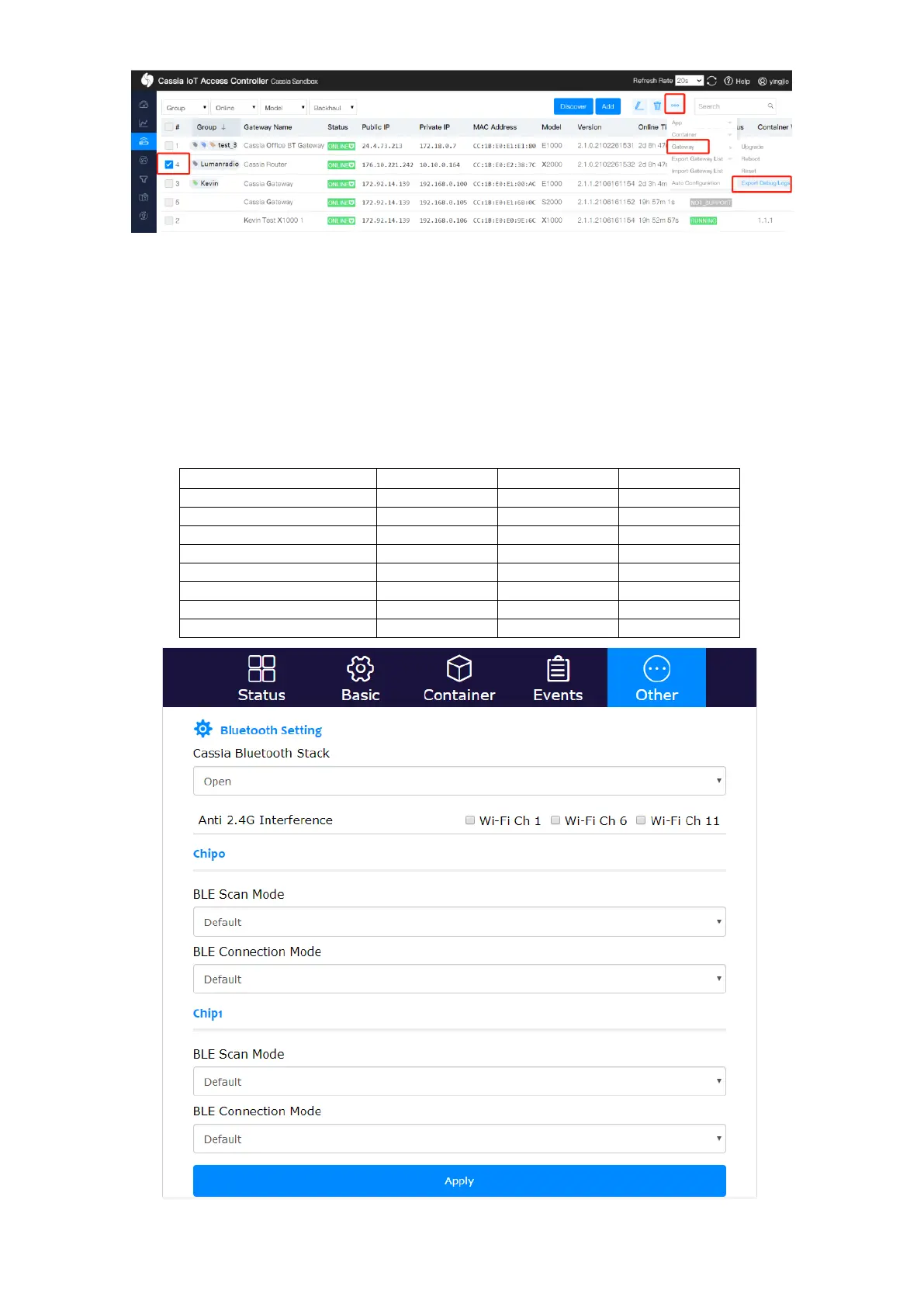 user can define the Cassia gateway’s Bluetooth Low Energy parameters, e.g. connection