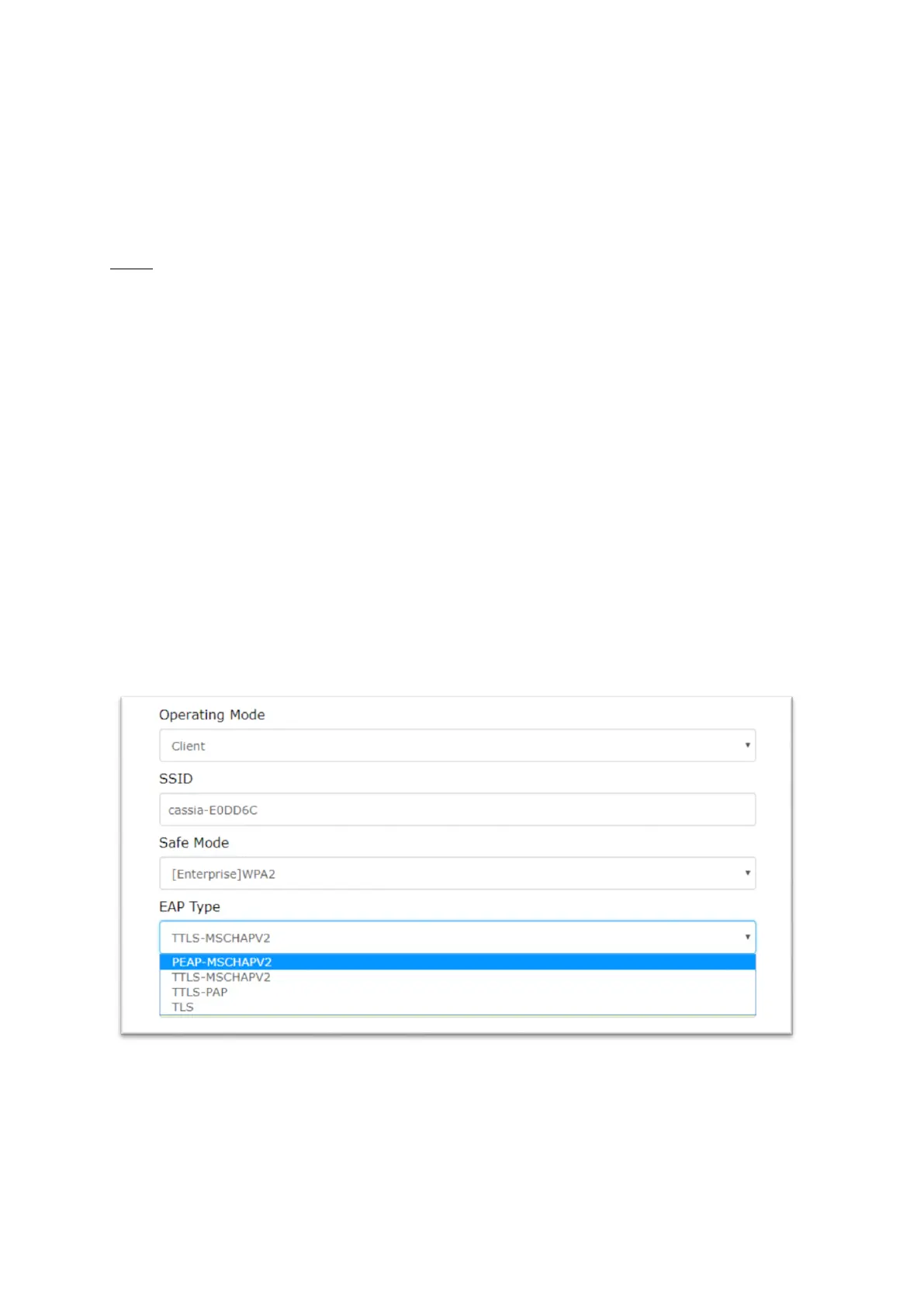 The user needs to set the Wi-Fi operation mode to “Client”, set the “Safe Mode” and “EAP