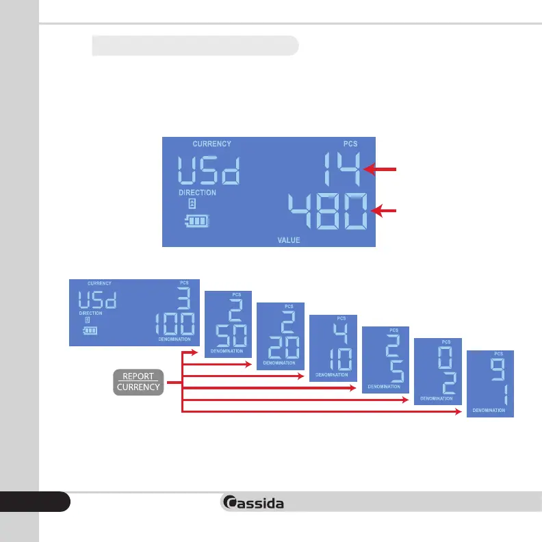 Press the REPORT/CURRENCY button once to view detailed report information. Each time the button